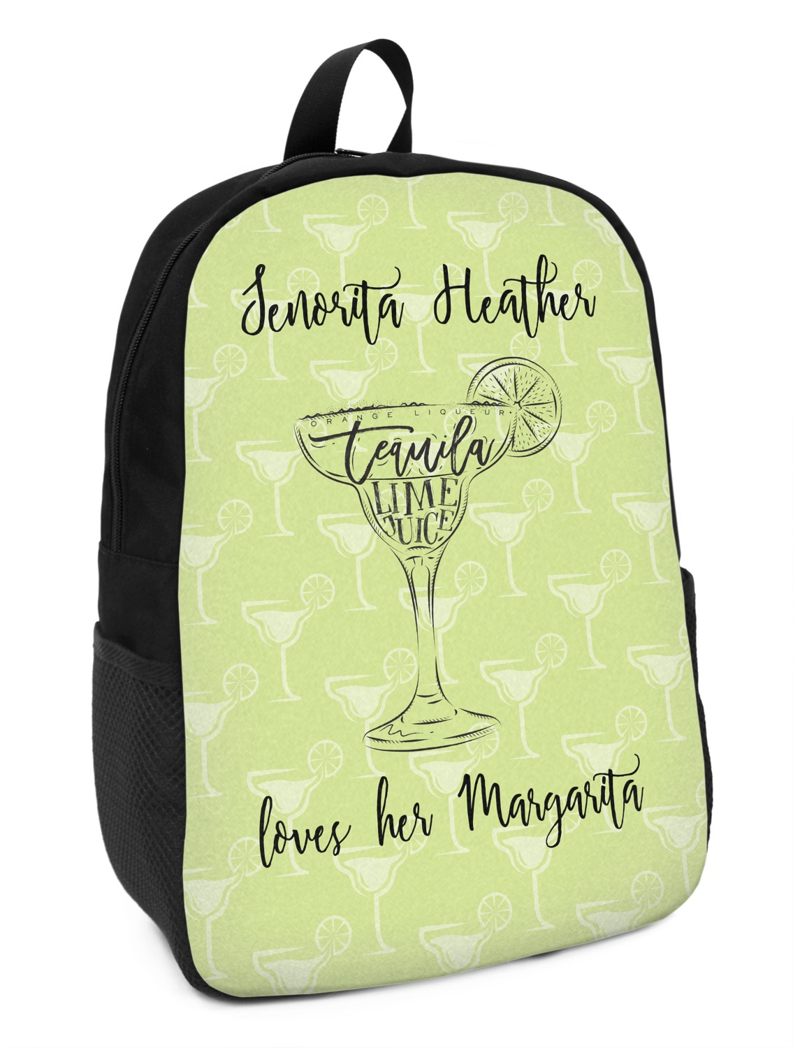 These small backpacks are made of a durable black canvas material with your personalization right on the front. The two shoulder straps are padded and easily adjustable. The bag itself measures at about 11" W x 15" H x 5" D. It's the perfect size for elementary aged kids or adults who want a smaller backpack. On the top of the bag you will find a handle to hang or carry your backpack by as well as a large zipper closure to keep all of your belongings safe inside. On each side of your backpack is a mesh pocket for a small item or water bottle. Inside your backpack you will find a spacious area with a small zipper pocket and a padded laptop slot that will fit up to a 13" laptop (13" being very snug). This is the perfect bag for any student that needs a couple books and their laptop with them at all times. It also works great as a carry on for traveling!