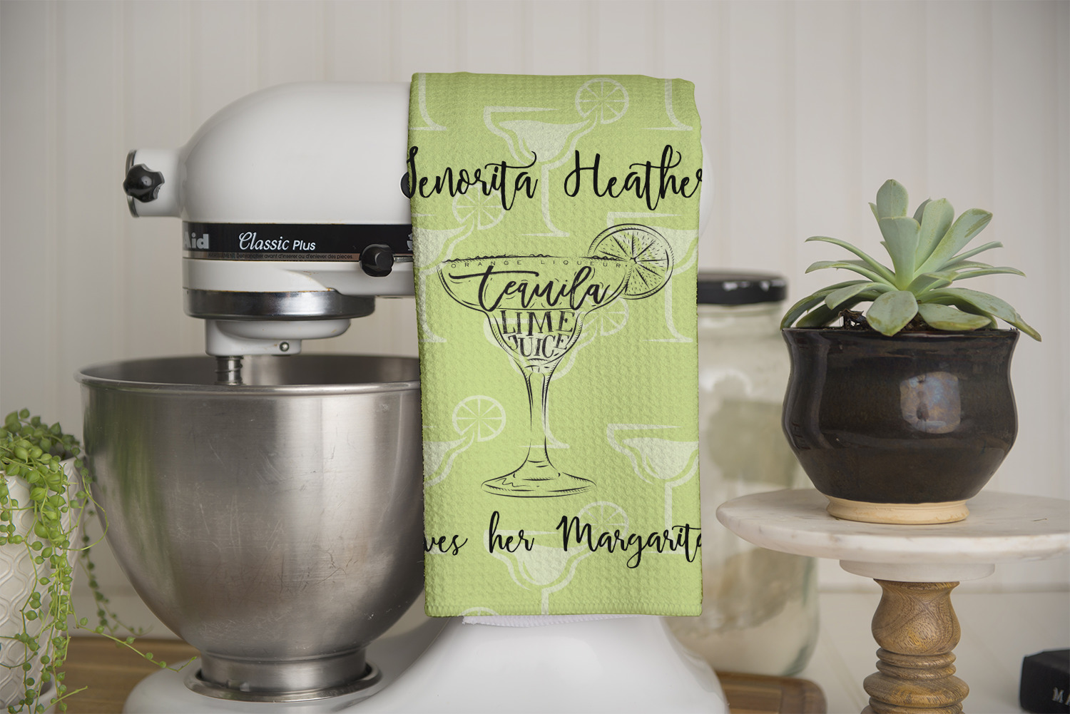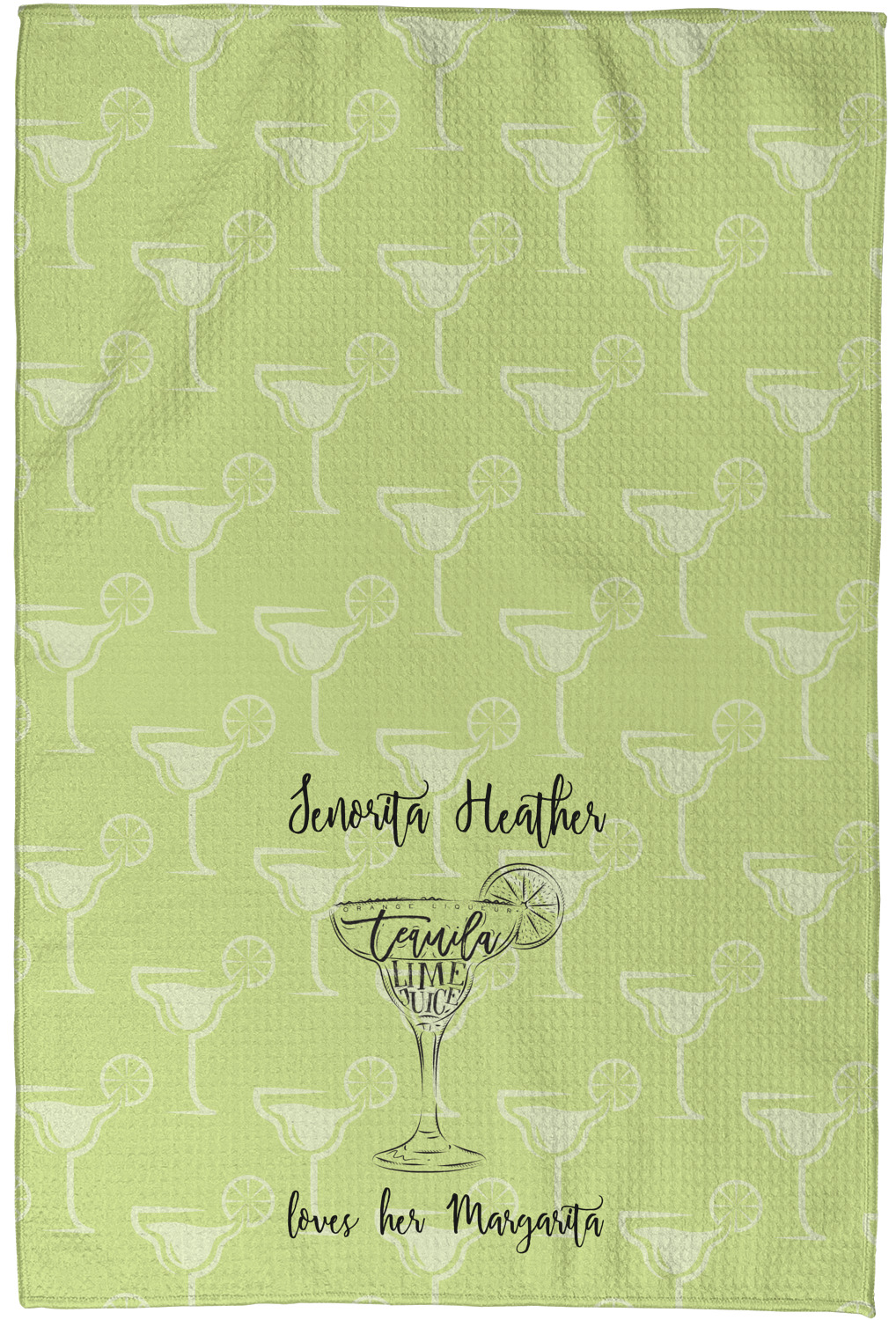 This margarita design has a lovely black illustration of a margarita glass with text inside saying "orange liqueur," "tequila," and "lime juice." Above and below this graphic is where your personalization goes. The pattern behind the graphic has a simpler margarita glass that is a light green while the rest of the pattern is a light lime green. This is a fun design to put on your beach, pool, or kitchen accessories.