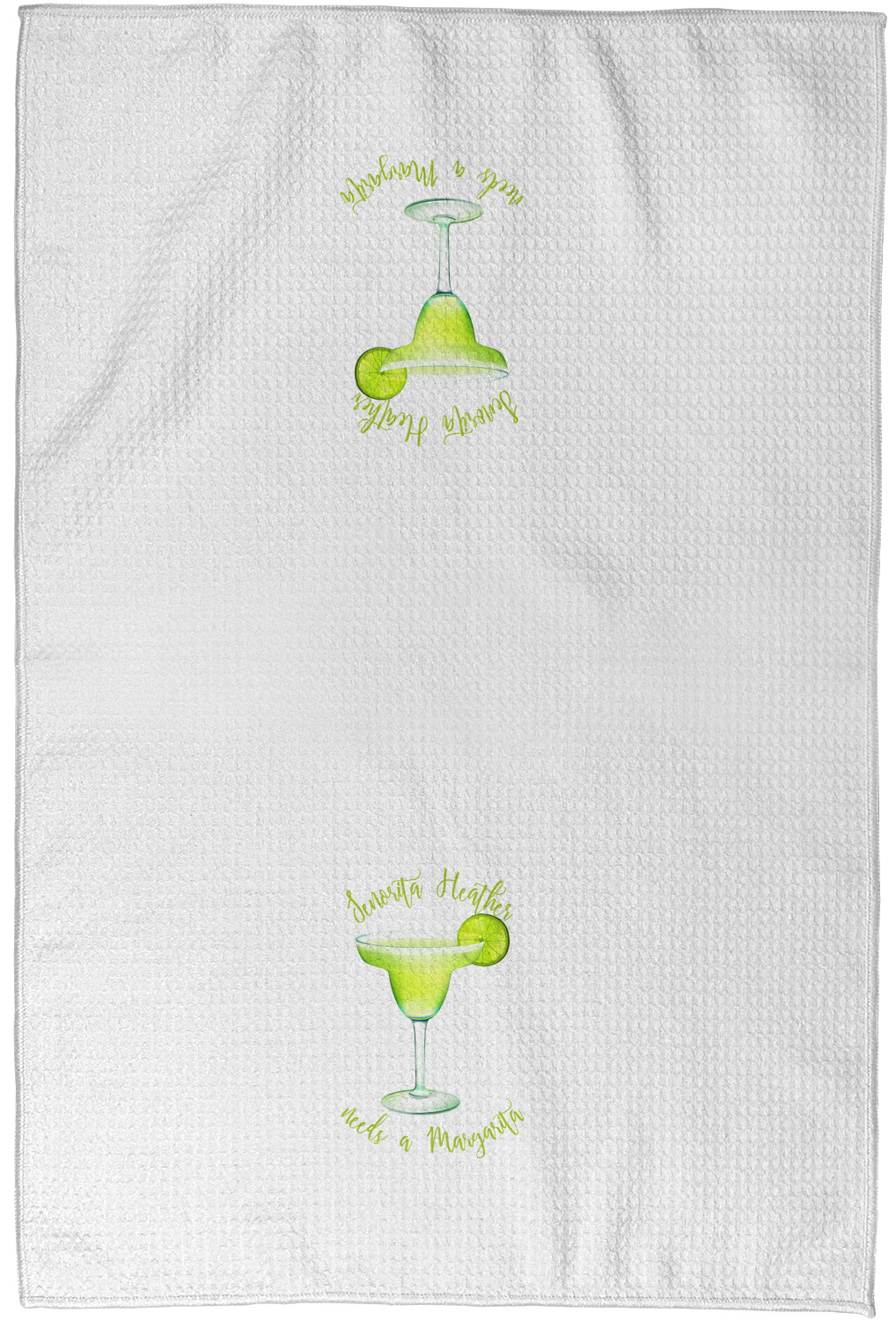 This margarita design has a lovely black illustration of a margarita glass with text inside saying "orange liqueur," "tequila," and "lime juice." Above and below this graphic is where your personalization goes. The pattern behind the graphic has a simpler margarita glass that is a light green while the rest of the pattern is a light lime green. This is a fun design to put on your beach, pool, or kitchen accessories.
