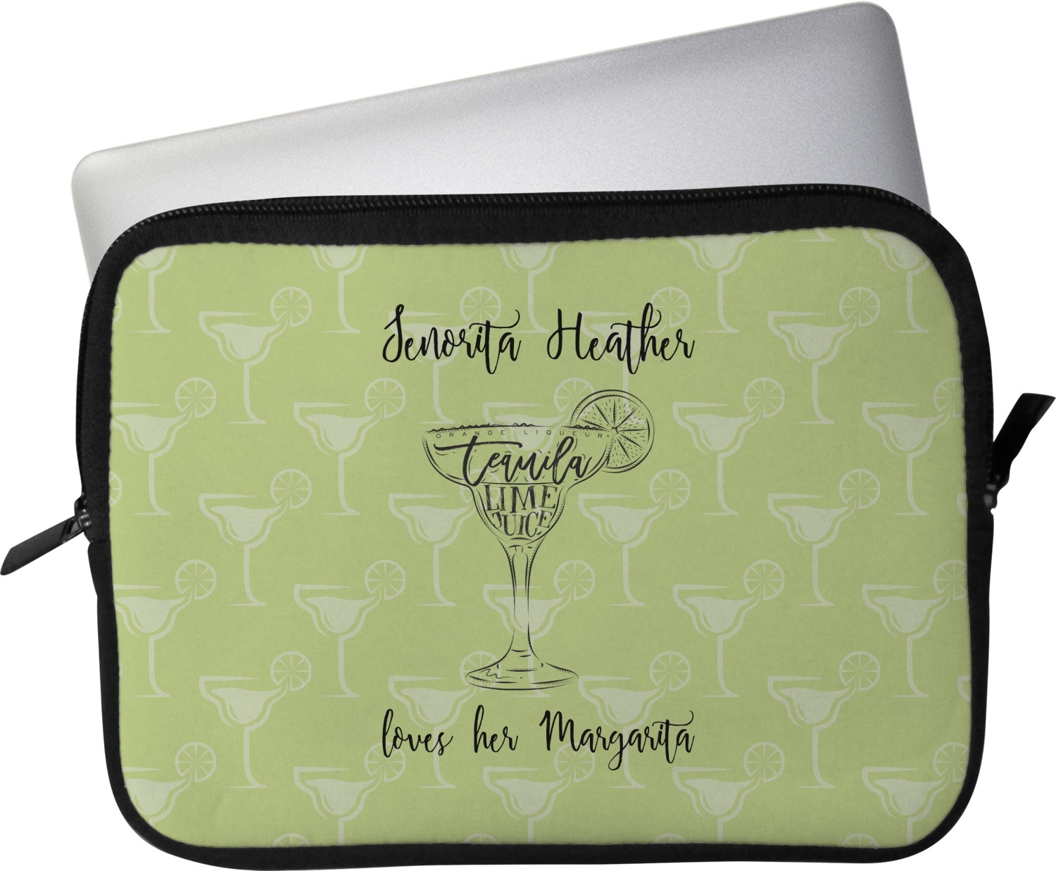 These laptop covers are built from a water-resistant, cushioned neoprene. We display your personalized design on the front of this computer sleeve, while the other sides are simply the black color of the neoprene fabric. A zipper lines the top half of this case, for direct access to your device. For added protection, the interior of this neoprene laptop sleeve is lined with a padded, minky-like material.
