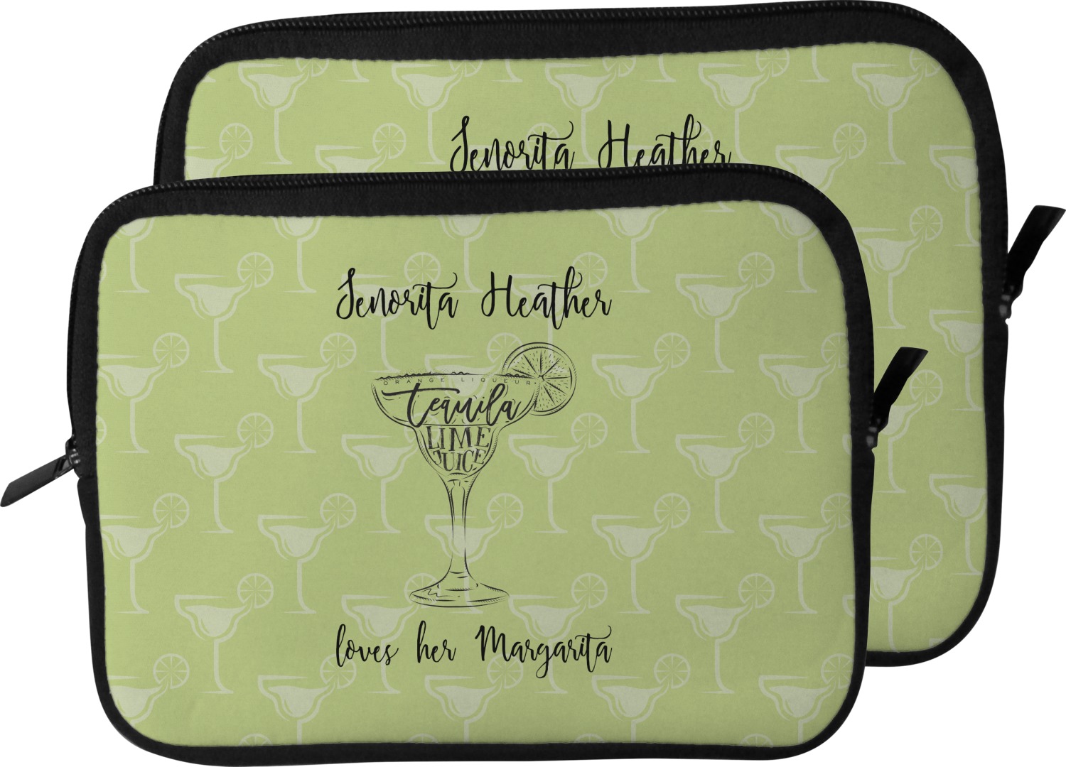 This margarita design has a lovely black illustration of a margarita glass with text inside saying "orange liqueur," "tequila," and "lime juice." Above and below this graphic is where your personalization goes. The pattern behind the graphic has a simpler margarita glass that is a light green while the rest of the pattern is a light lime green. This is a fun design to put on your beach, pool, or kitchen accessories.