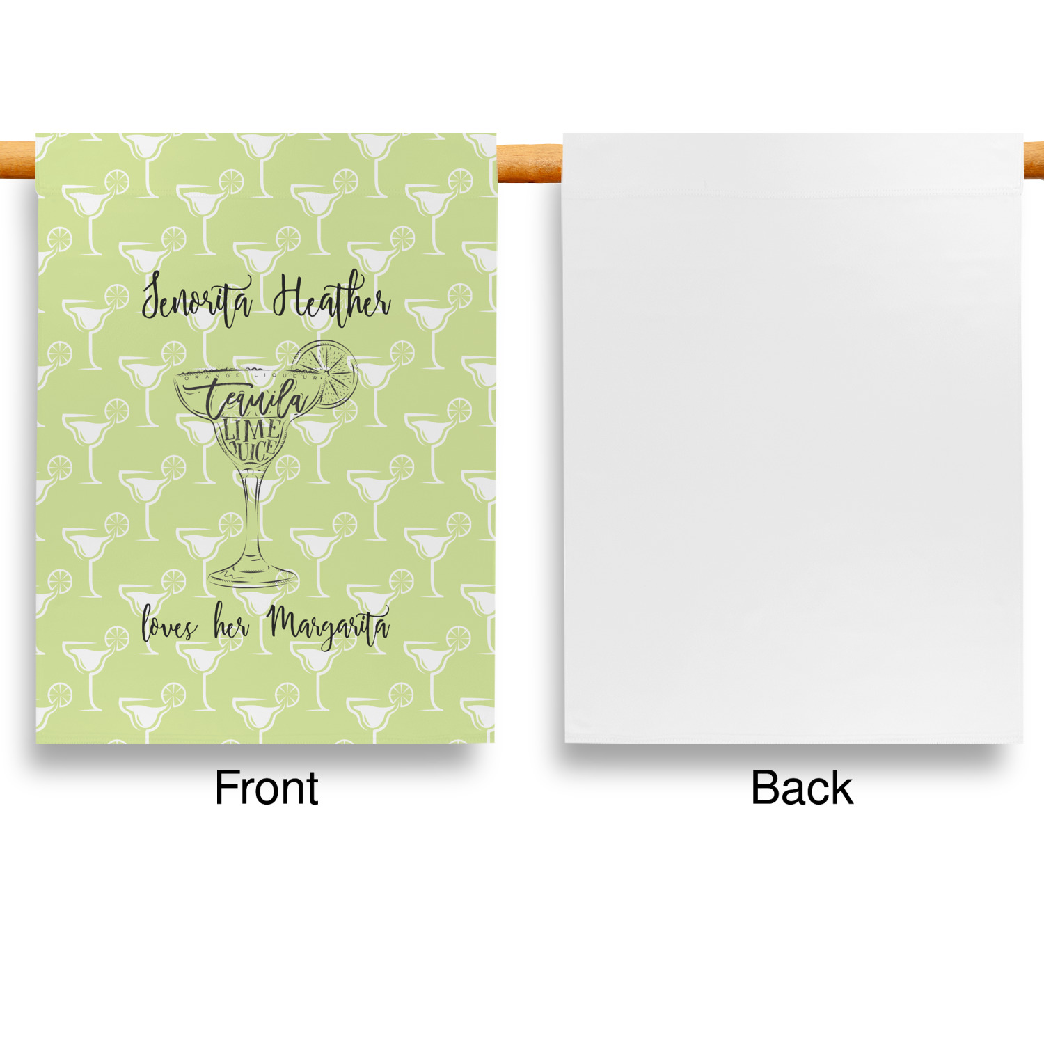 These custom garden flags are made of a durable, double-ply, polyester weave, allowing them to withstand the elements year round. The small flags measure at approximately 12 by 18 inches. The large flags measure out to 28 by 37 inches. You can order these decorative flags with your customization printed on the front only, or the front and back.