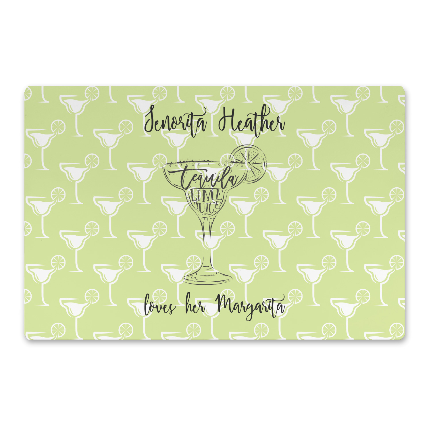 This margarita design has a lovely black illustration of a margarita glass with text inside saying "orange liqueur," "tequila," and "lime juice." Above and below this graphic is where your personalization goes. The pattern behind the graphic has a simpler margarita glass that is a light green while the rest of the pattern is a light lime green. This is a fun design to put on your beach, pool, or kitchen accessories.