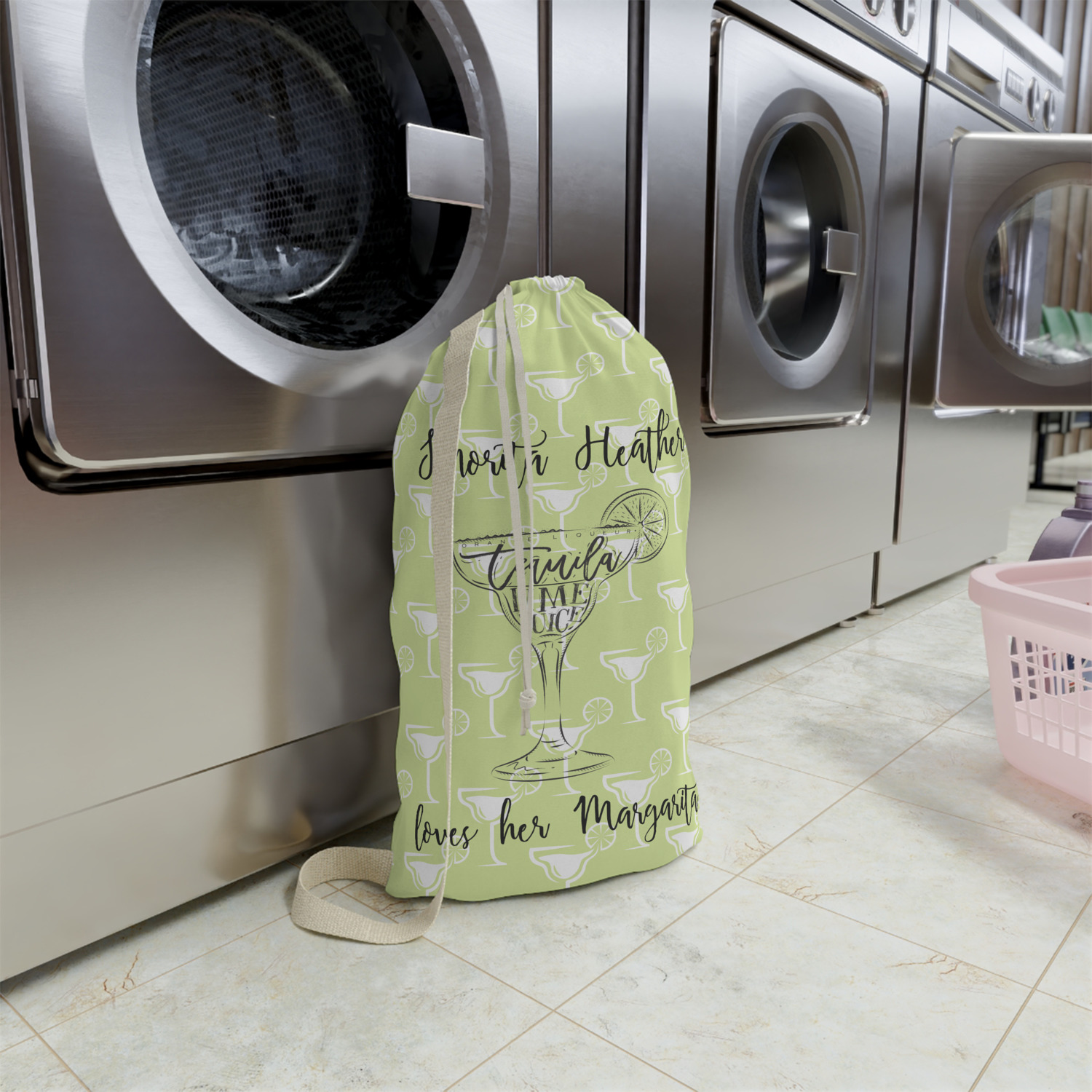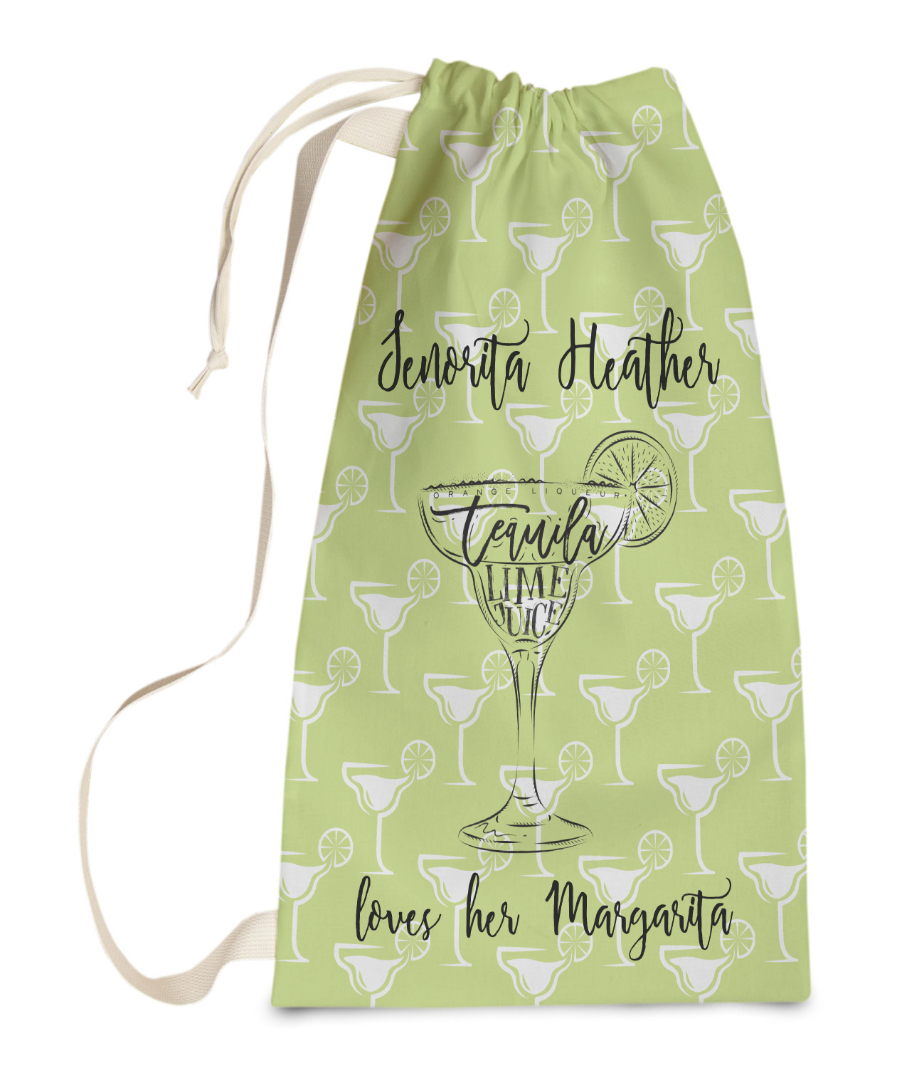 Carry your laundry in style with these customized laundry bags. Available in two sizes, featuring a natural colored woven strap and a cinch cord, these bags hold a lot of clothes or anything else you want to fit in them.