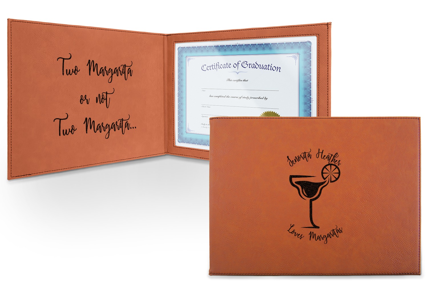 This cognac-colored, leatherette certificate jacket is the ideal way to display or store your hard-earned certificate. When closed, the custom certificate holder measures at 12 by 9 inches. The interior of the certificate cover includes a clear, vinyl window to encase your diploma. The window measures at around 10.5 by 7.5 inches and can accommodate a diploma that measures at up to 8.5 by 11 inches. You can either choose to have your customization laser engraved on the front and interior, or solely the front.