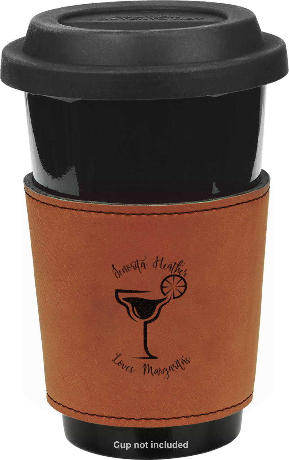 This cup sleeve is made from a suave, cognac-brown leatherette and finished with an intricate, black stitch. The interior of this can sleeve is fabricated from a thin foam material to help insulate your mug's contents. The sleeve is specifically made to suit tapered glasses or mugs, so the top's diameter is 3.5 inches, while the bottom's diameter is 2.75 inches. Your customized design will be laser engraved into the leatherette, leaving behind crisp, black imprint. With these products, we provide you with the option of engraving the front and back, or the front only.