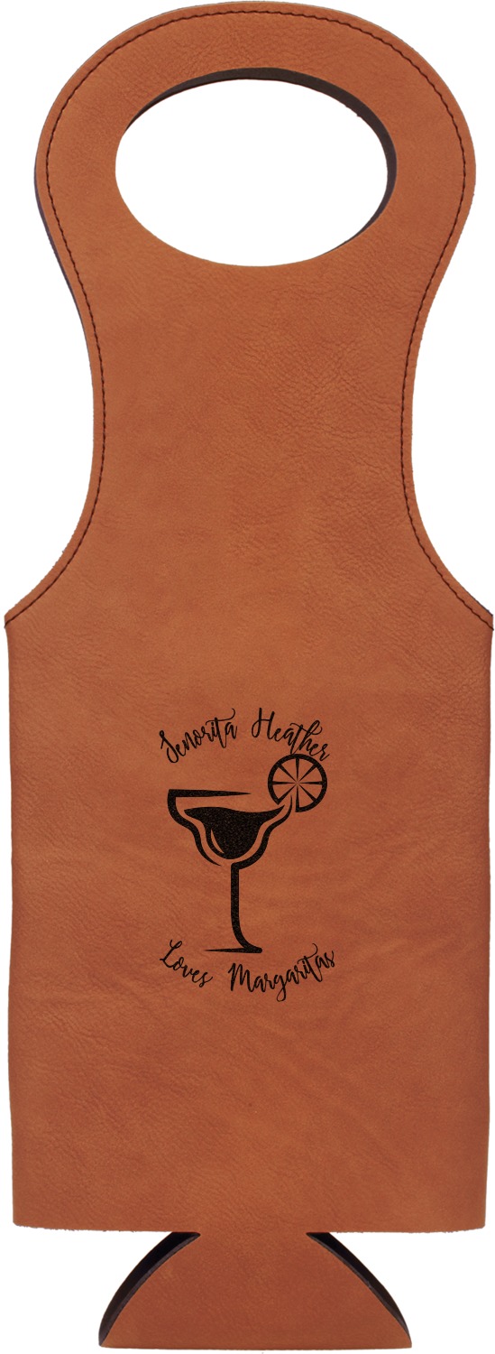 This wine carrier is made from a stunning leatherette, in a cognac-brown color. Strong, black stitching lines the sides of your wine bottle bag and provides extra durability. The interior is lined with a padded, black material to allow for a snug fit once your bottle is placed inside. At the top of this wine gift bag, you'll find two oval shaped handles that elegantly complements the rest of the bag's style. We provide you with the option of laser-engraving the front, or the front and back of your new personalized wine bag!