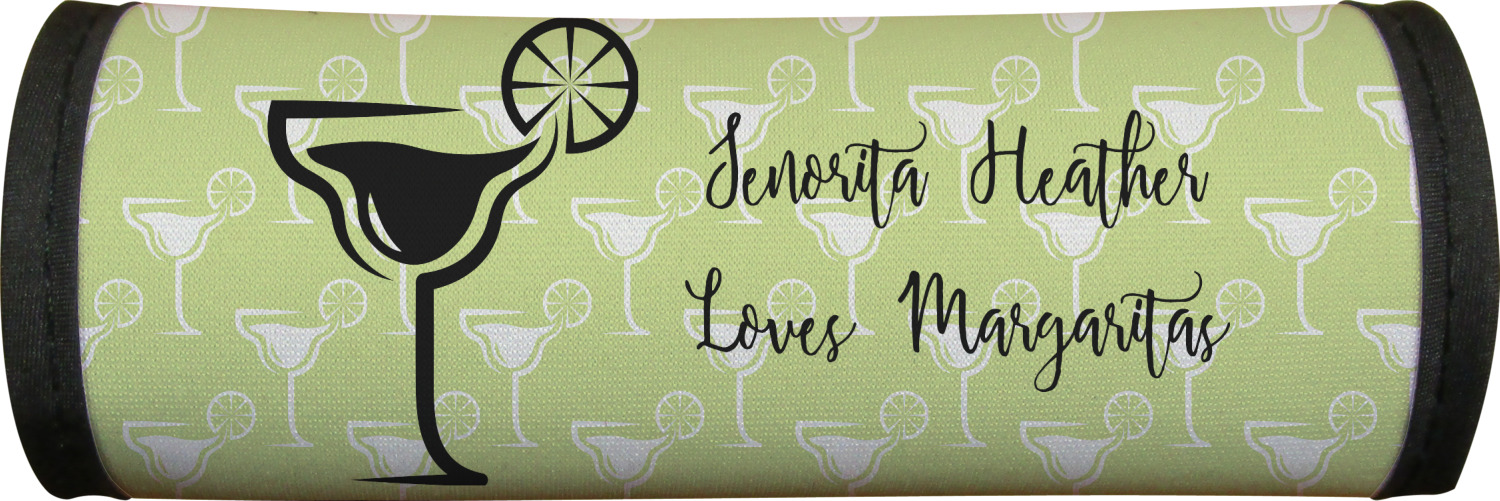 The luggage handle covers are made of neoprene with black trim and have Velcro closure to snugly fit around the handle. Your design is printed on the neoprene. The covers measure approx 5"x6".