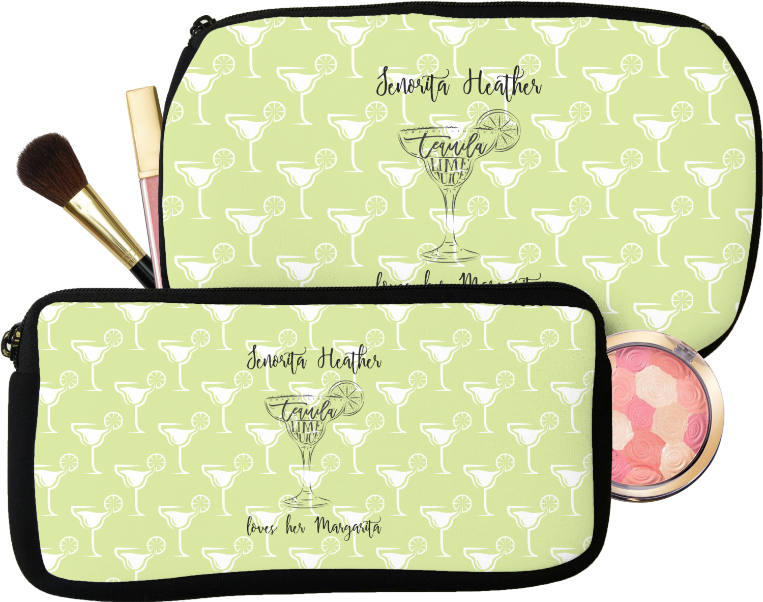 Our personalized makeup bags are available in many different designs, patterns and colors - so you are sure to find one that will love. They are made of neoprene (same material as wet-suits) and thus are water resistant, so spillages in your makeup bag will not end up all over you purse. They are customized on one side and are black on the other side and the zipper is black as well.