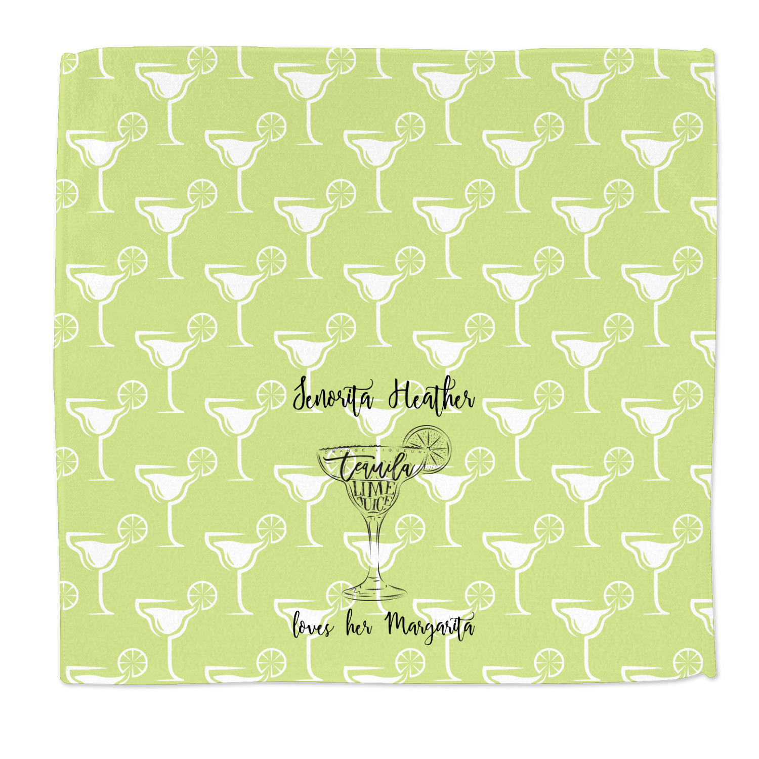 This margarita design has a lovely black illustration of a margarita glass with text inside saying "orange liqueur," "tequila," and "lime juice." Above and below this graphic is where your personalization goes. The pattern behind the graphic has a simpler margarita glass that is a light green while the rest of the pattern is a light lime green. This is a fun design to put on your beach, pool, or kitchen accessories.