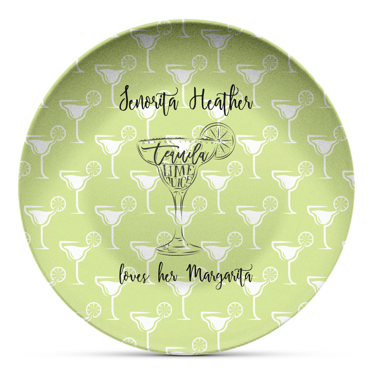 This margarita design has a lovely black illustration of a margarita glass with text inside saying "orange liqueur," "tequila," and "lime juice." Above and below this graphic is where your personalization goes. The pattern behind the graphic has a simpler margarita glass that is a light green while the rest of the pattern is a light lime green. This is a fun design to put on your beach, pool, or kitchen accessories.