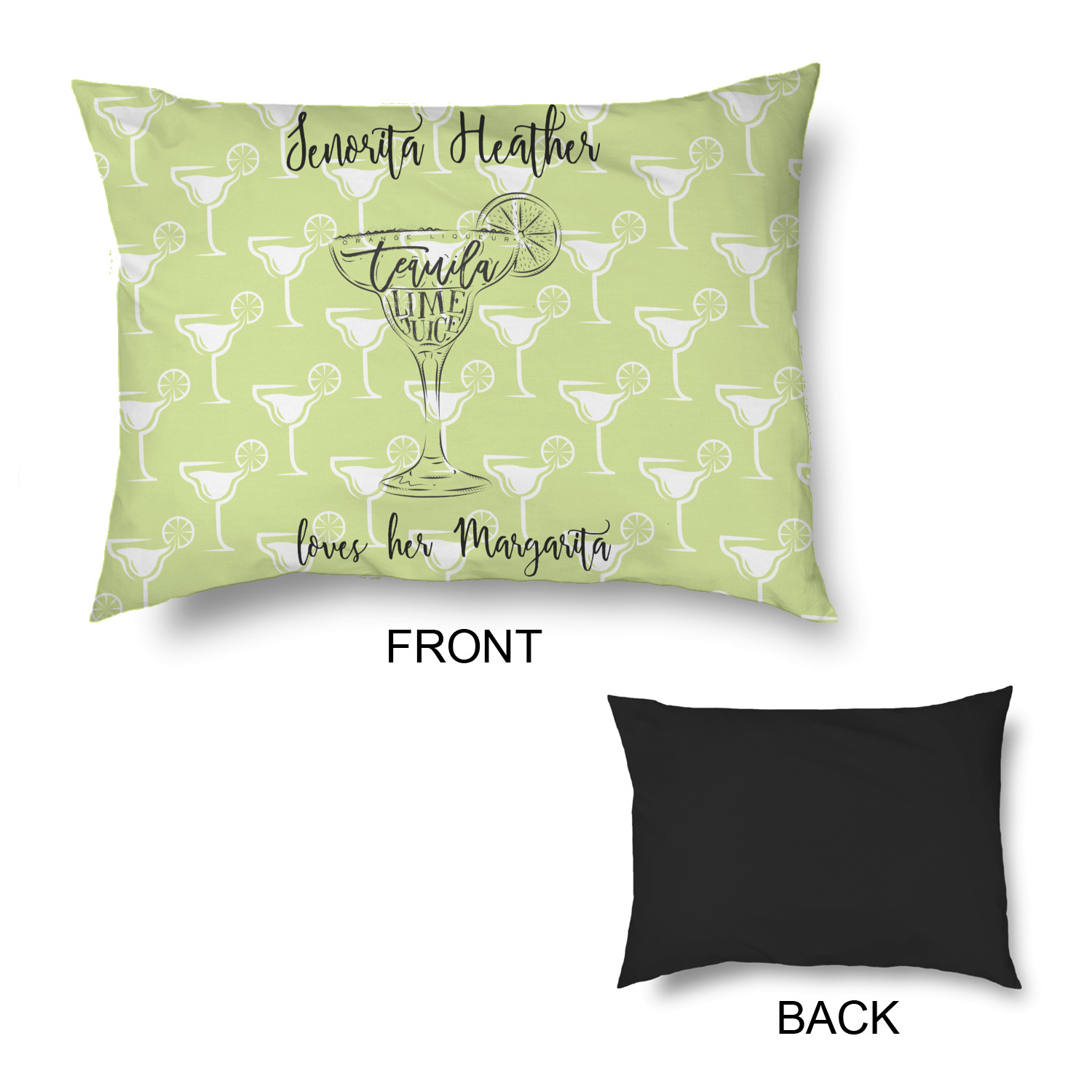 This margarita design has a lovely black illustration of a margarita glass with text inside saying "orange liqueur," "tequila," and "lime juice." Above and below this graphic is where your personalization goes. The pattern behind the graphic has a simpler margarita glass that is a light green while the rest of the pattern is a light lime green. This is a fun design to put on your beach, pool, or kitchen accessories.