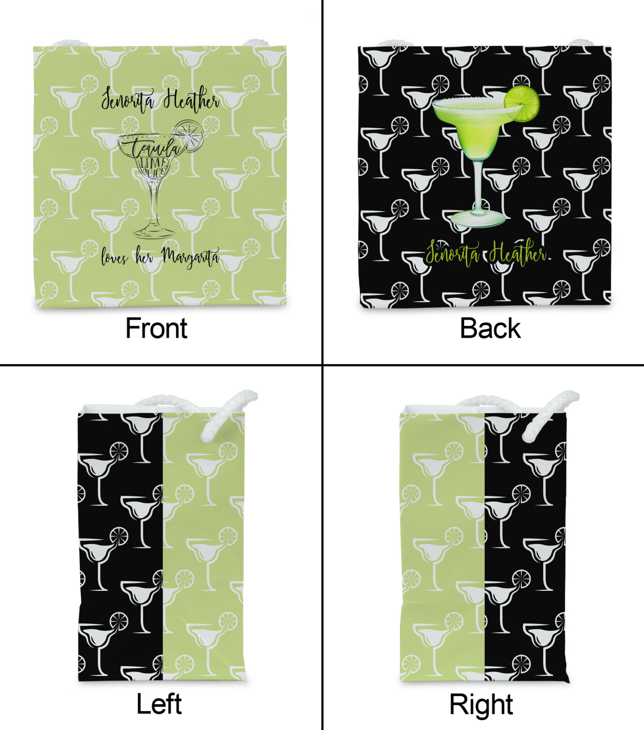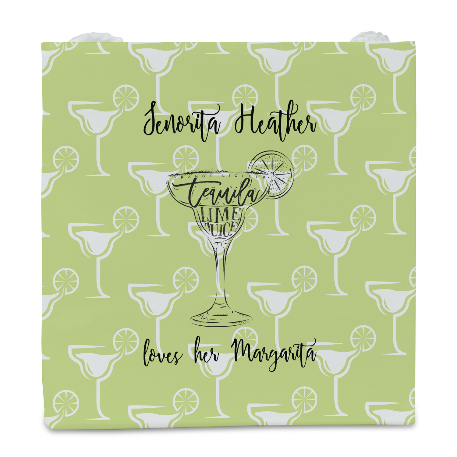 This margarita design has a lovely black illustration of a margarita glass with text inside saying "orange liqueur," "tequila," and "lime juice." Above and below this graphic is where your personalization goes. The pattern behind the graphic has a simpler margarita glass that is a light green while the rest of the pattern is a light lime green. This is a fun design to put on your beach, pool, or kitchen accessories.