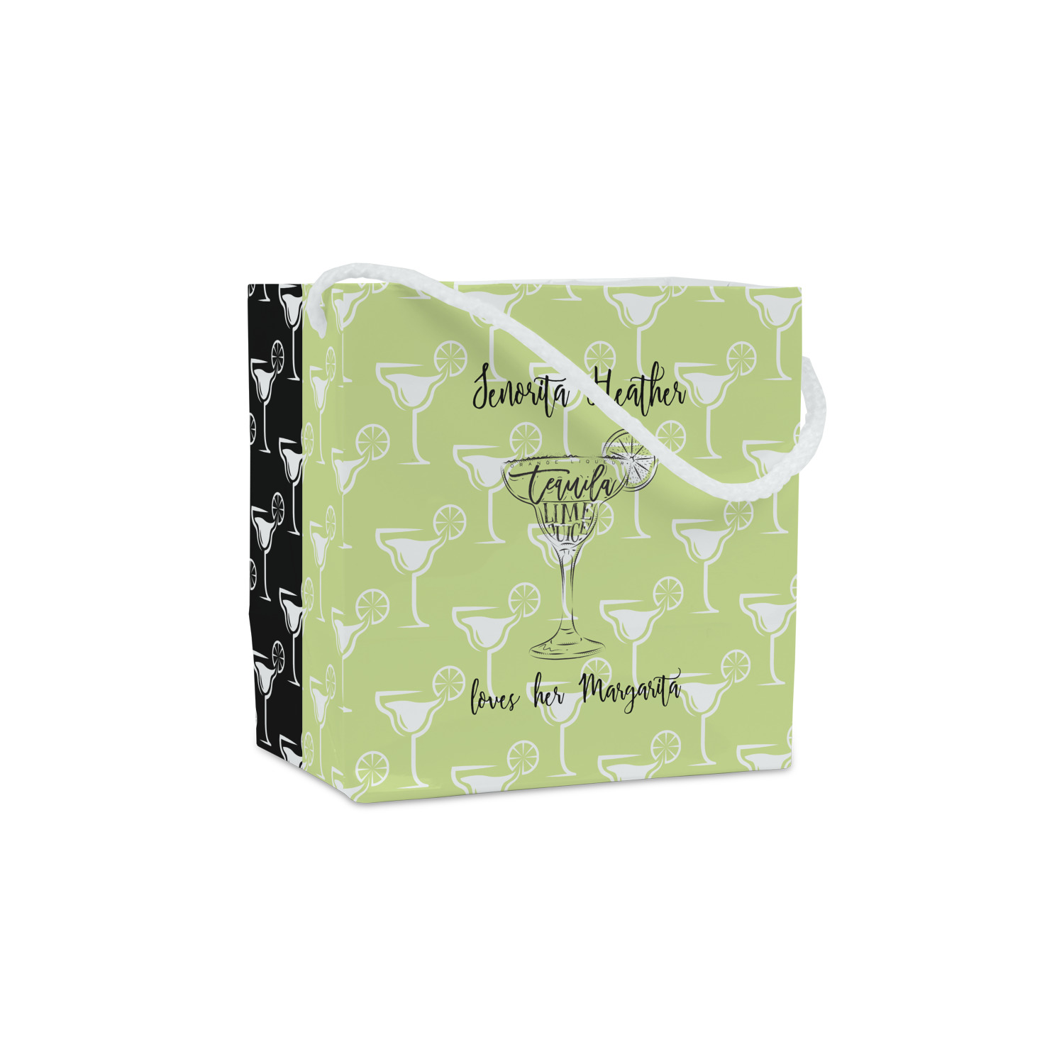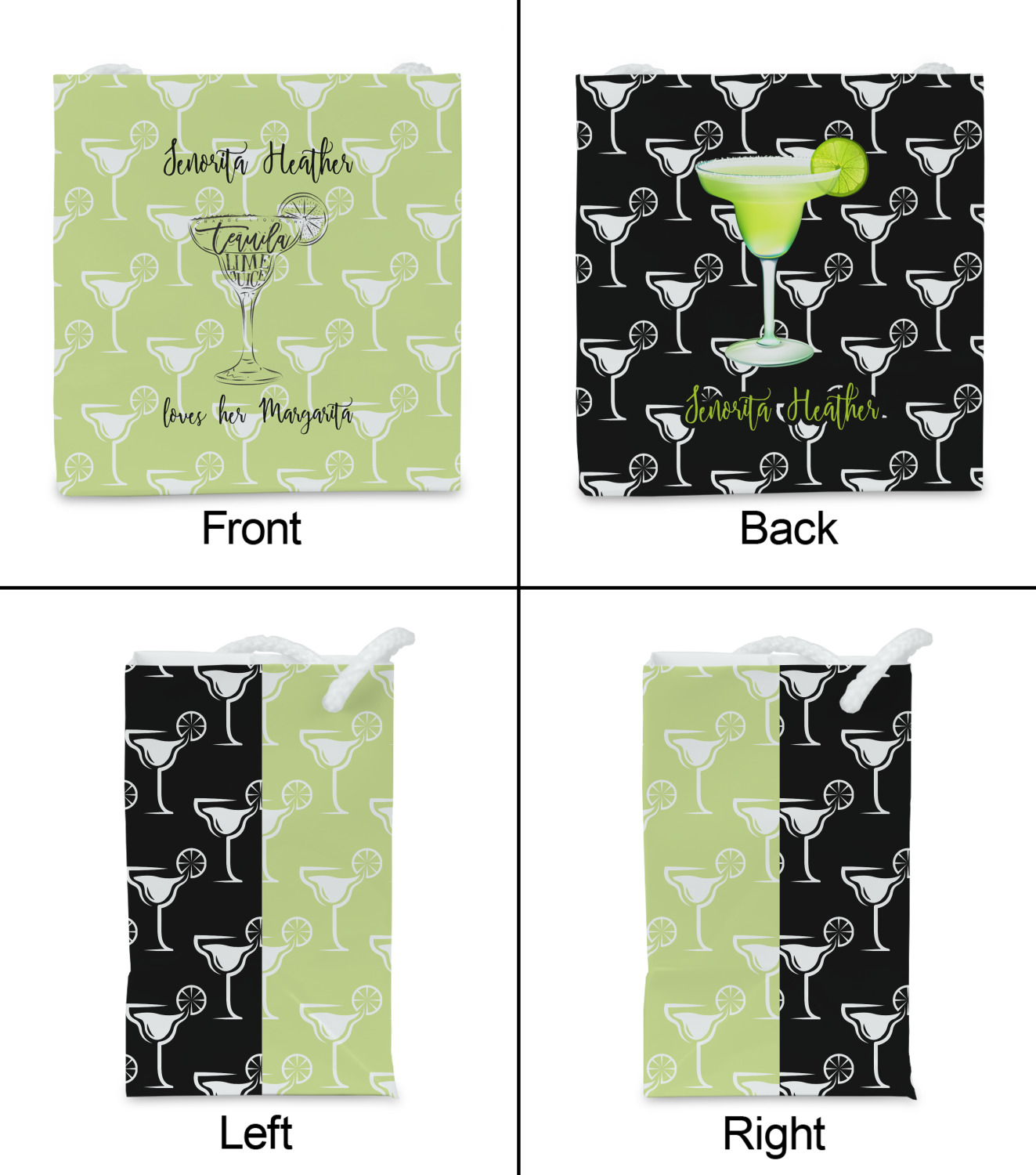 This margarita design has a lovely black illustration of a margarita glass with text inside saying "orange liqueur," "tequila," and "lime juice." Above and below this graphic is where your personalization goes. The pattern behind the graphic has a simpler margarita glass that is a light green while the rest of the pattern is a light lime green. This is a fun design to put on your beach, pool, or kitchen accessories.