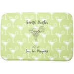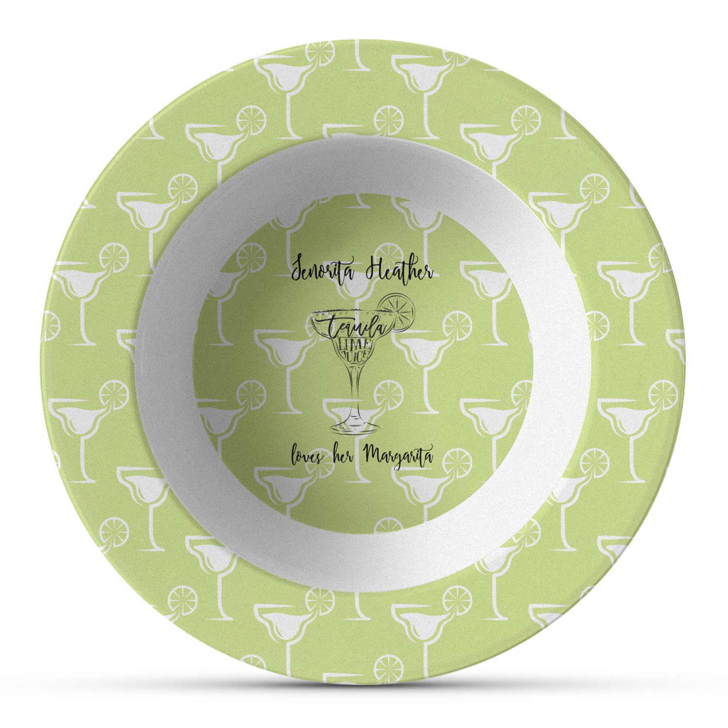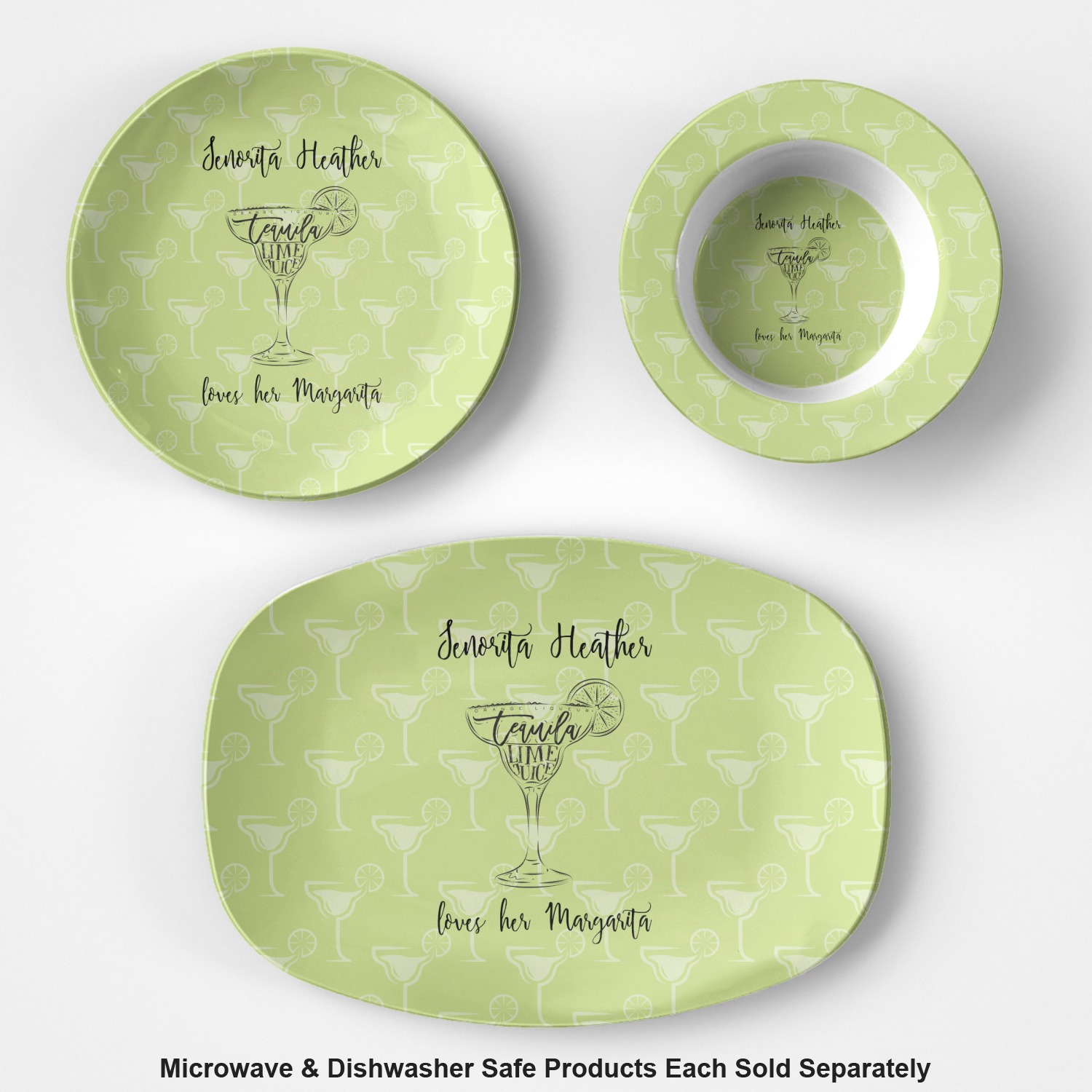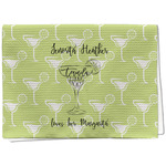 This margarita design has a lovely black illustration of a margarita glass with text inside saying "orange liqueur," "tequila," and "lime juice." Above and below this graphic is where your personalization goes. The pattern behind the graphic has a simpler margarita glass that is a light green while the rest of the pattern is a light lime green. This is a fun design to put on your beach, pool, or kitchen accessories.