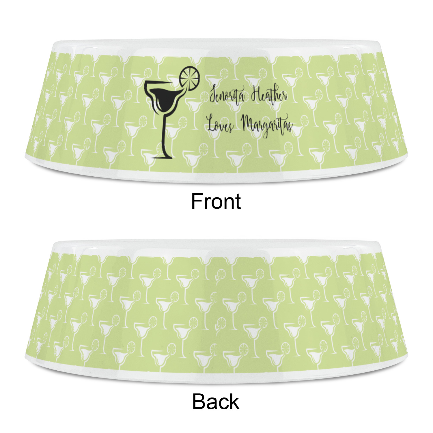 This margarita design has a lovely black illustration of a margarita glass with text inside saying "orange liqueur," "tequila," and "lime juice." Above and below this graphic is where your personalization goes. The pattern behind the graphic has a simpler margarita glass that is a light green while the rest of the pattern is a light lime green. This is a fun design to put on your beach, pool, or kitchen accessories.