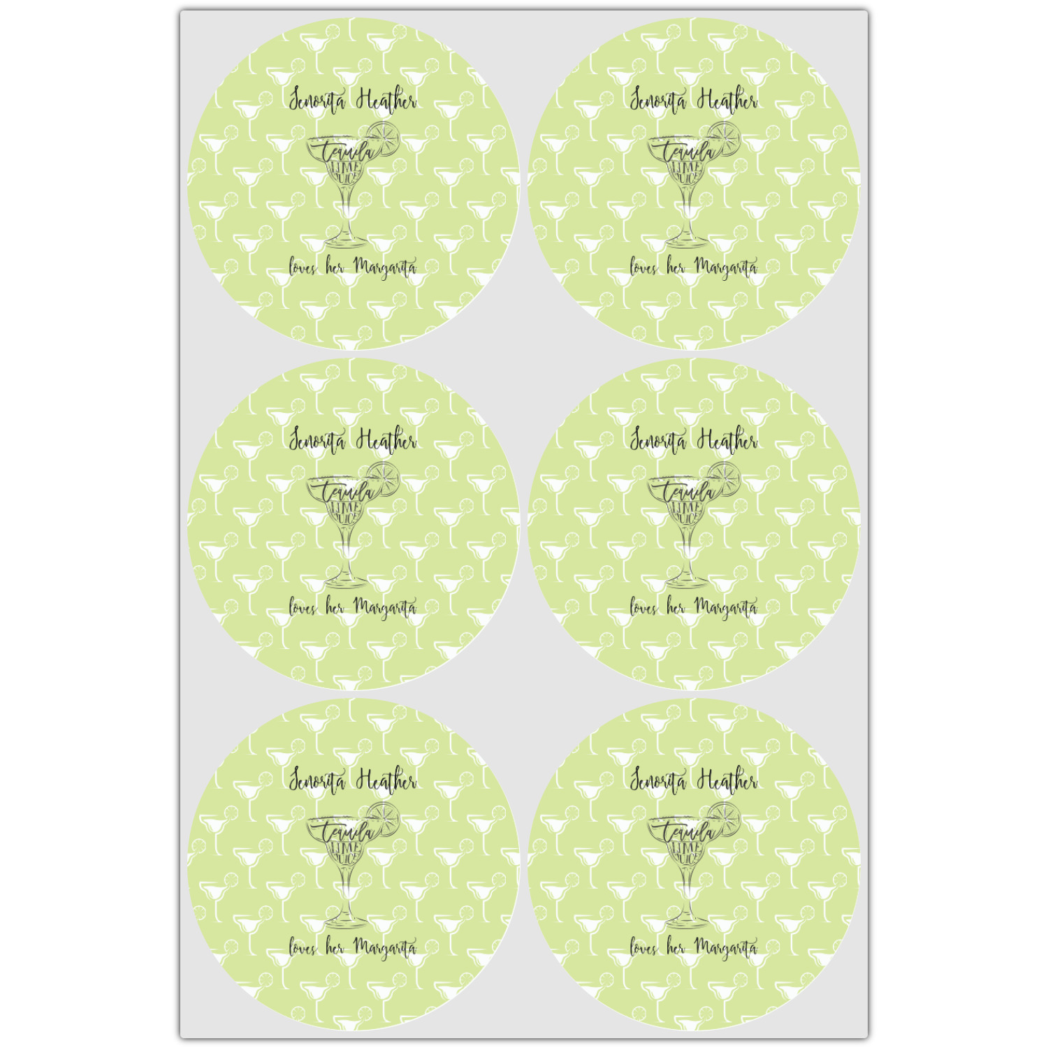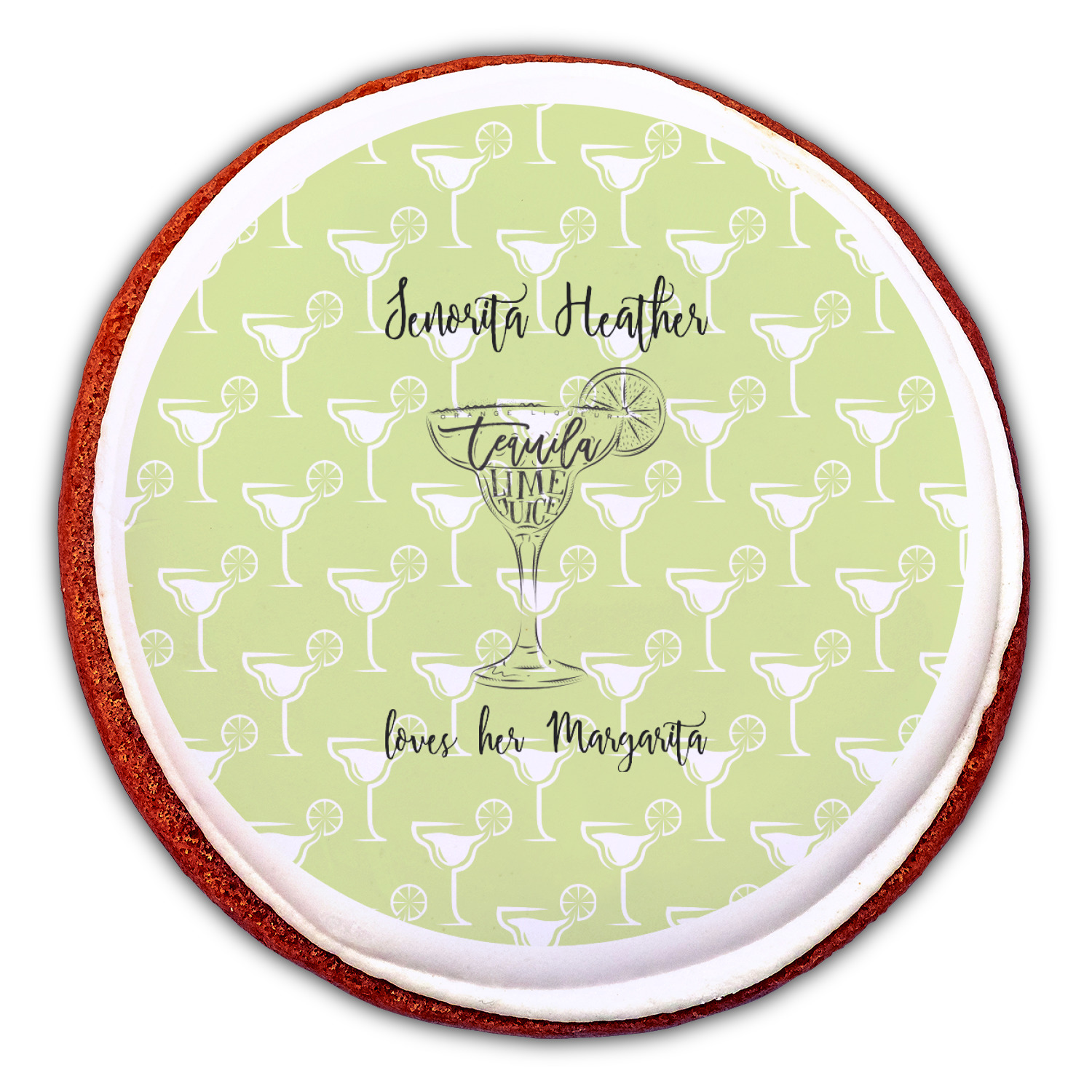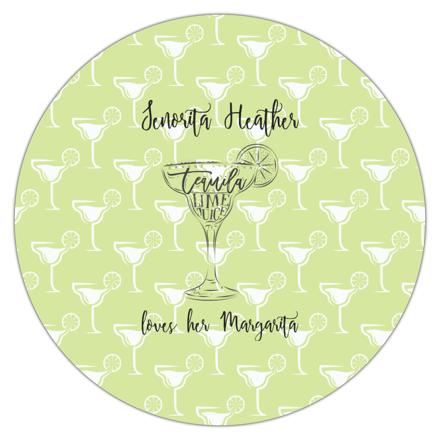 This margarita design has a lovely black illustration of a margarita glass with text inside saying "orange liqueur," "tequila," and "lime juice." Above and below this graphic is where your personalization goes. The pattern behind the graphic has a simpler margarita glass that is a light green while the rest of the pattern is a light lime green. This is a fun design to put on your beach, pool, or kitchen accessories.