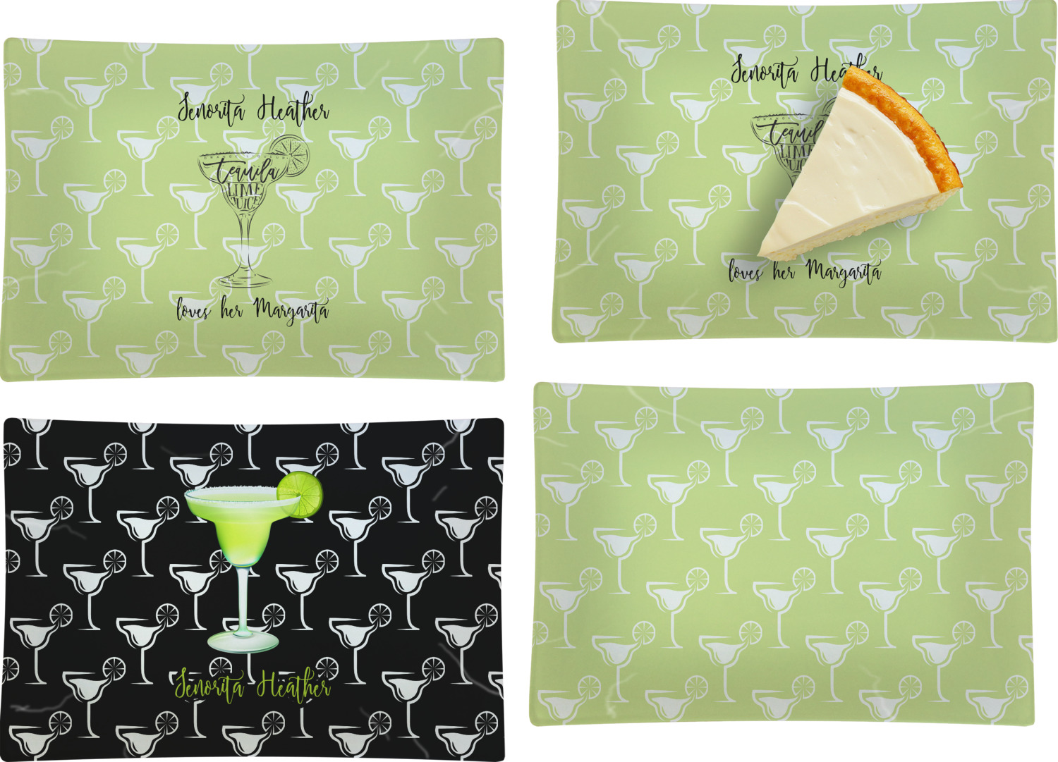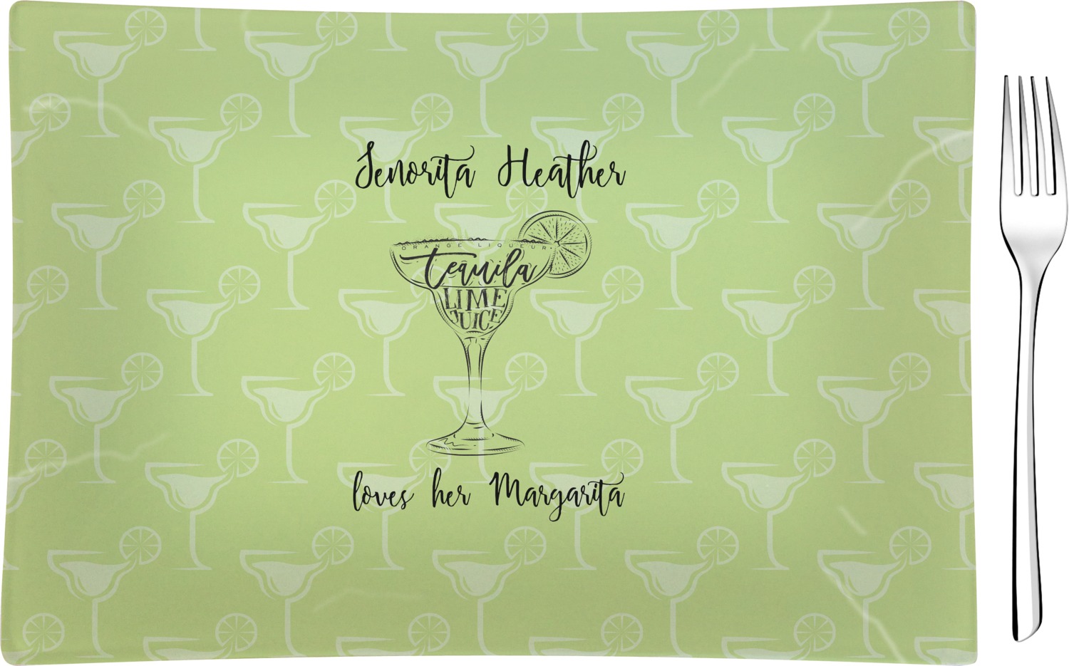 This margarita design has a lovely black illustration of a margarita glass with text inside saying "orange liqueur," "tequila," and "lime juice." Above and below this graphic is where your personalization goes. The pattern behind the graphic has a simpler margarita glass that is a light green while the rest of the pattern is a light lime green. This is a fun design to put on your beach, pool, or kitchen accessories.
