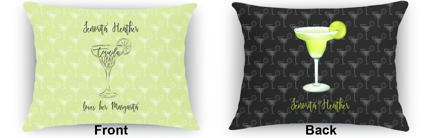 This margarita design has a lovely black illustration of a margarita glass with text inside saying "orange liqueur," "tequila," and "lime juice." Above and below this graphic is where your personalization goes. The pattern behind the graphic has a simpler margarita glass that is a light green while the rest of the pattern is a light lime green. This is a fun design to put on your beach, pool, or kitchen accessories.