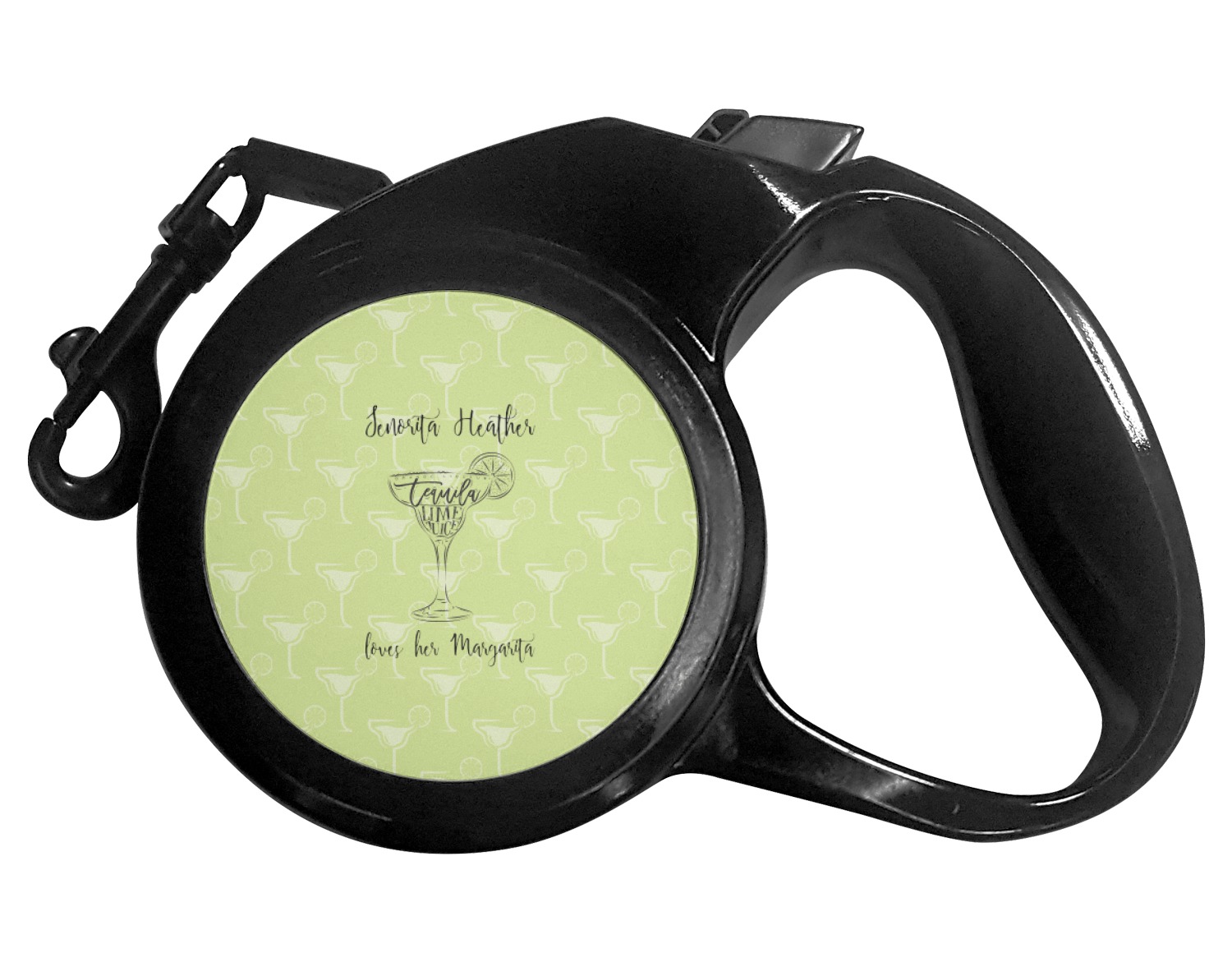 The leash's plastic handle is accommodating of your grip and displays your customization on both sides. The dog leash also features the traditional bolt snap clip, for easy fastening to your dog's collar. The leash and leash handle themselves are both black in color.
