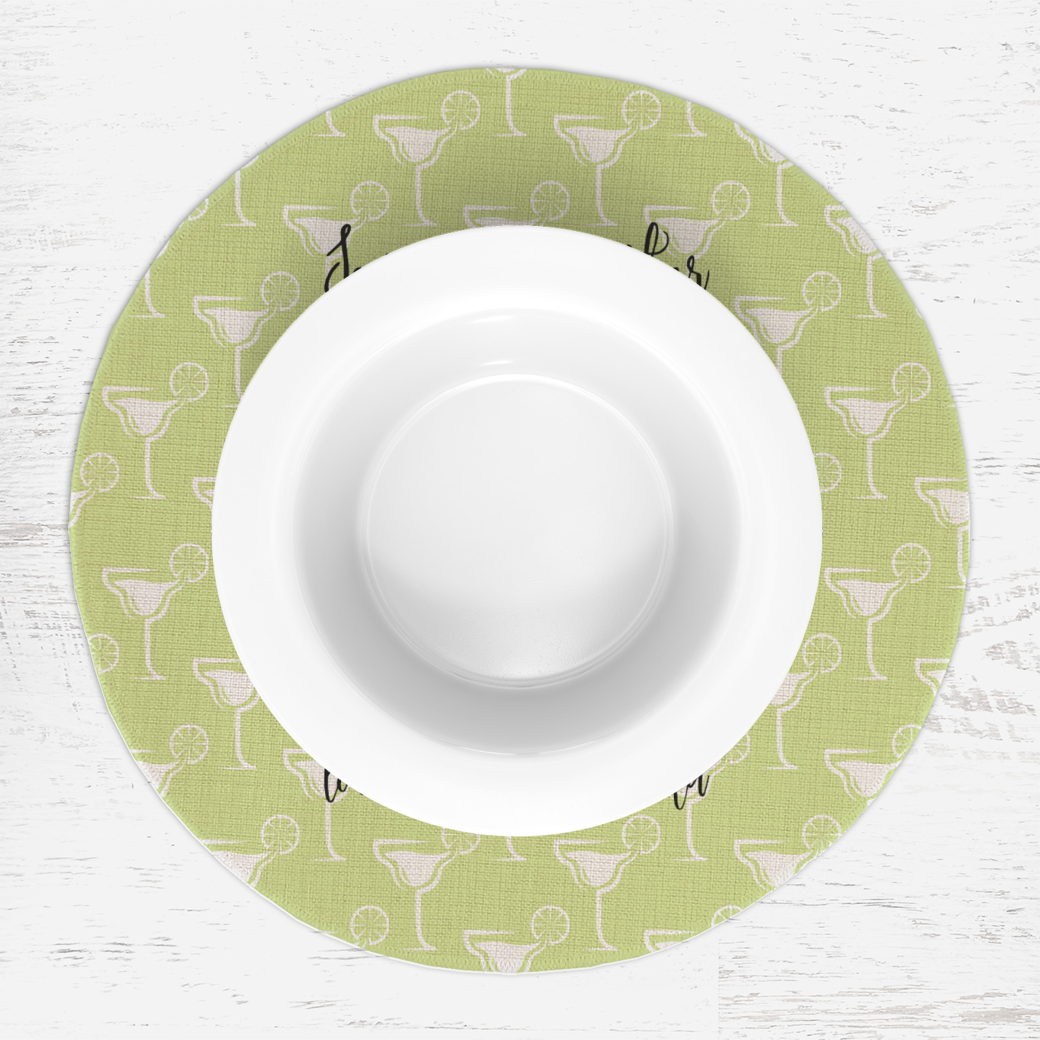 This margarita design has a lovely black illustration of a margarita glass with text inside saying "orange liqueur," "tequila," and "lime juice." Above and below this graphic is where your personalization goes. The pattern behind the graphic has a simpler margarita glass that is a light green while the rest of the pattern is a light lime green. This is a fun design to put on your beach, pool, or kitchen accessories.