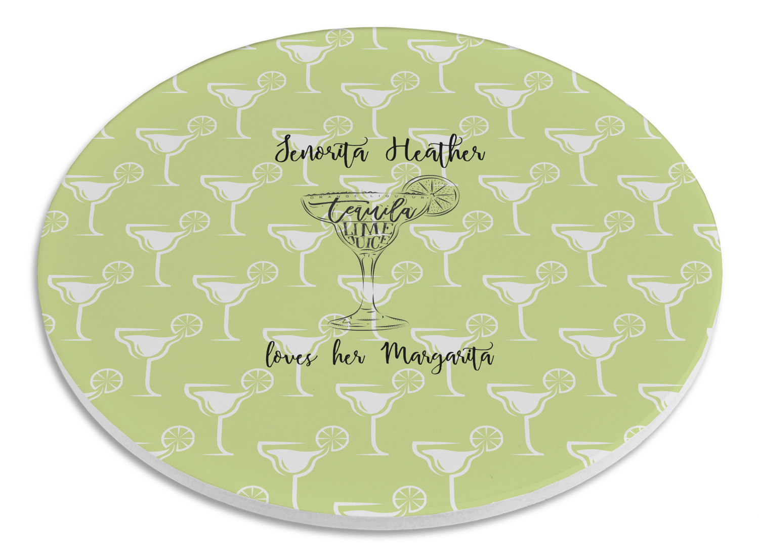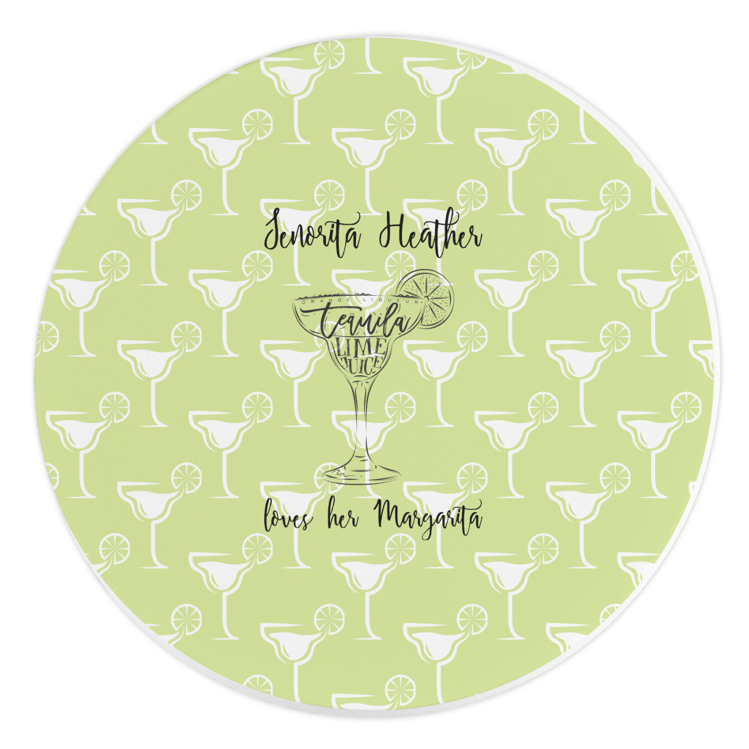 This margarita design has a lovely black illustration of a margarita glass with text inside saying "orange liqueur," "tequila," and "lime juice." Above and below this graphic is where your personalization goes. The pattern behind the graphic has a simpler margarita glass that is a light green while the rest of the pattern is a light lime green. This is a fun design to put on your beach, pool, or kitchen accessories.
