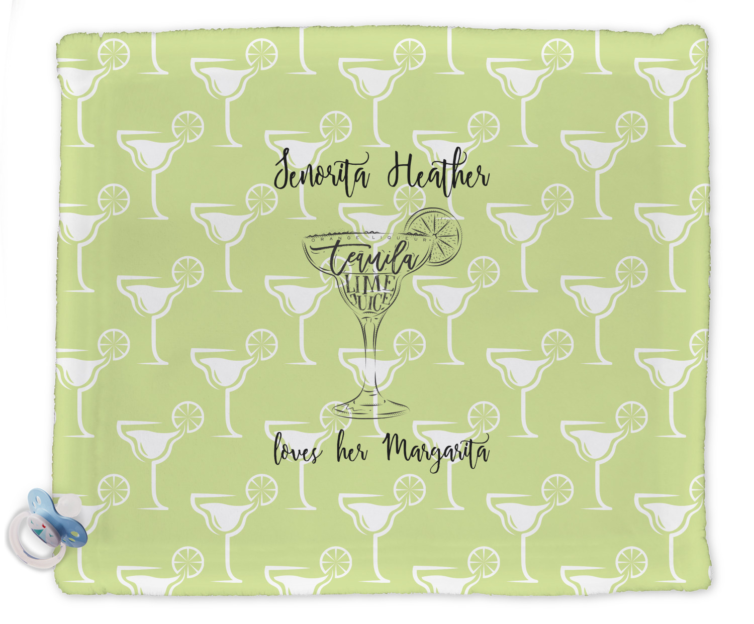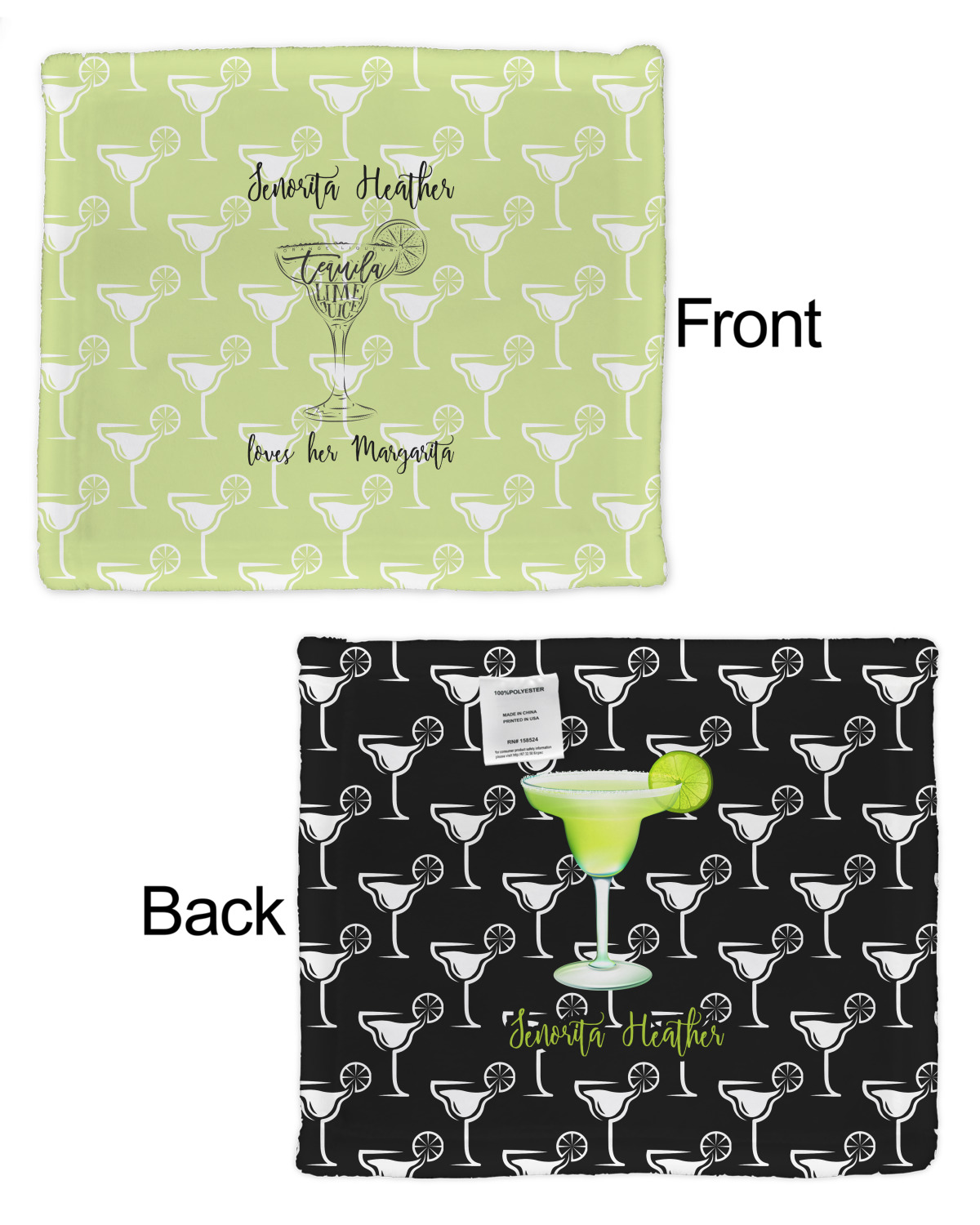 This margarita design has a lovely black illustration of a margarita glass with text inside saying "orange liqueur," "tequila," and "lime juice." Above and below this graphic is where your personalization goes. The pattern behind the graphic has a simpler margarita glass that is a light green while the rest of the pattern is a light lime green. This is a fun design to put on your beach, pool, or kitchen accessories.