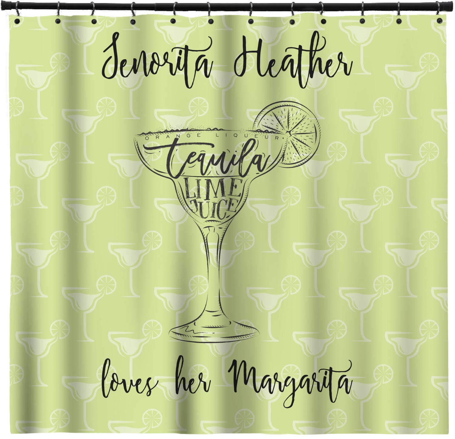 This margarita design has a lovely black illustration of a margarita glass with text inside saying "orange liqueur," "tequila," and "lime juice." Above and below this graphic is where your personalization goes. The pattern behind the graphic has a simpler margarita glass that is a light green while the rest of the pattern is a light lime green. This is a fun design to put on your beach, pool, or kitchen accessories.