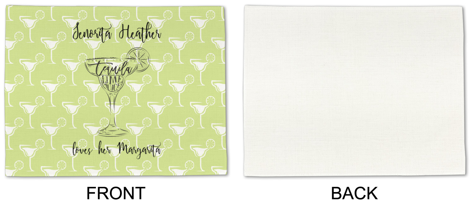 This margarita design has a lovely black illustration of a margarita glass with text inside saying "orange liqueur," "tequila," and "lime juice." Above and below this graphic is where your personalization goes. The pattern behind the graphic has a simpler margarita glass that is a light green while the rest of the pattern is a light lime green. This is a fun design to put on your beach, pool, or kitchen accessories.