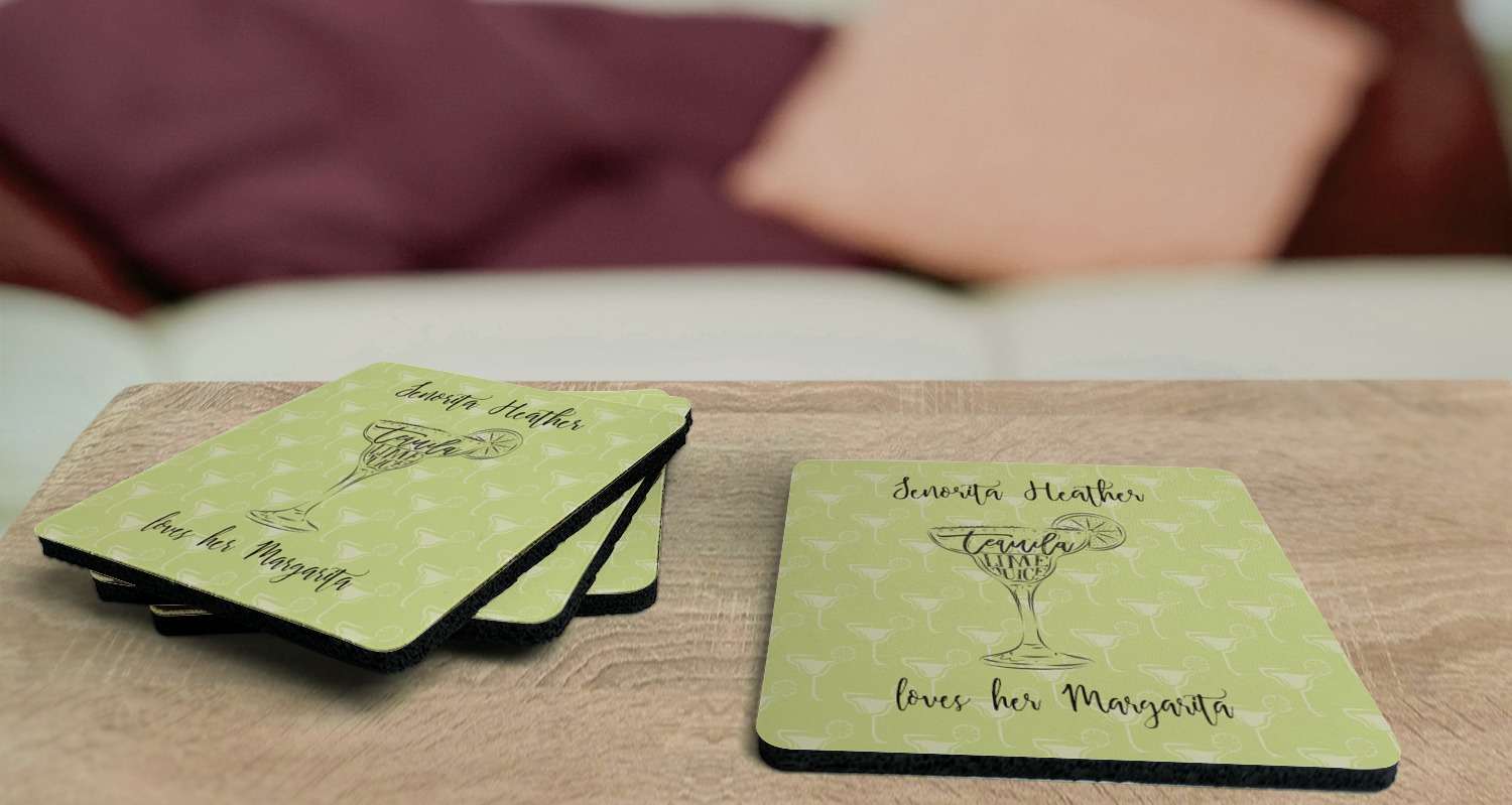 These drink coasters have a smooth, polyester top and a textured, rubber backing on its bottom. The non-slip rubber backing underneath works to keep any spills at bay. At 4 by 4 by 0.25 inches thick, these custom coasters are a suitable size for most drinkware. Your personalization is displayed atop the face of the cup coaster. We sell these rubber coasters in two different shapes: square and round. You can buy each shape as singulars or as a set of 4.