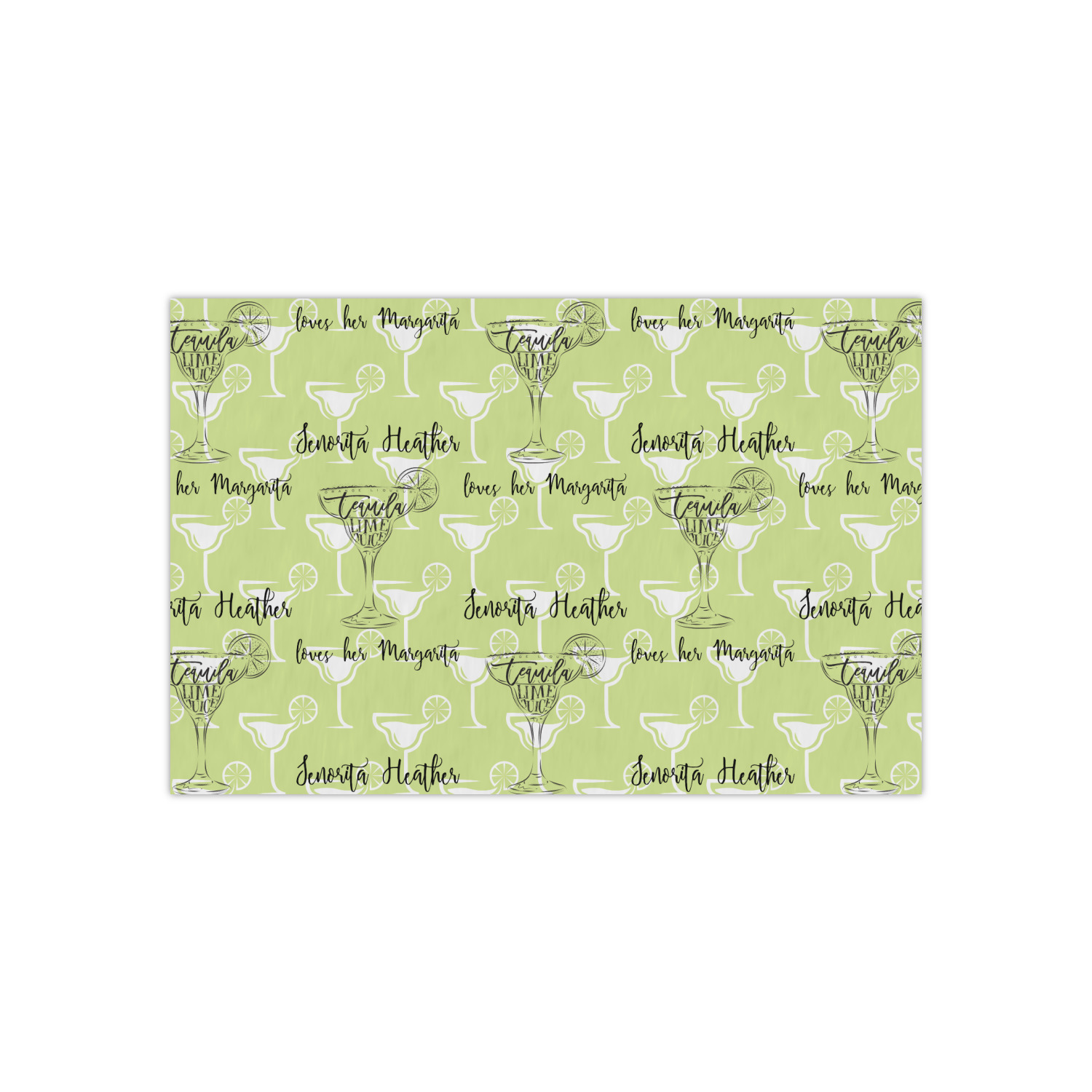 This margarita design has a lovely black illustration of a margarita glass with text inside saying "orange liqueur," "tequila," and "lime juice." Above and below this graphic is where your personalization goes. The pattern behind the graphic has a simpler margarita glass that is a light green while the rest of the pattern is a light lime green. This is a fun design to put on your beach, pool, or kitchen accessories.