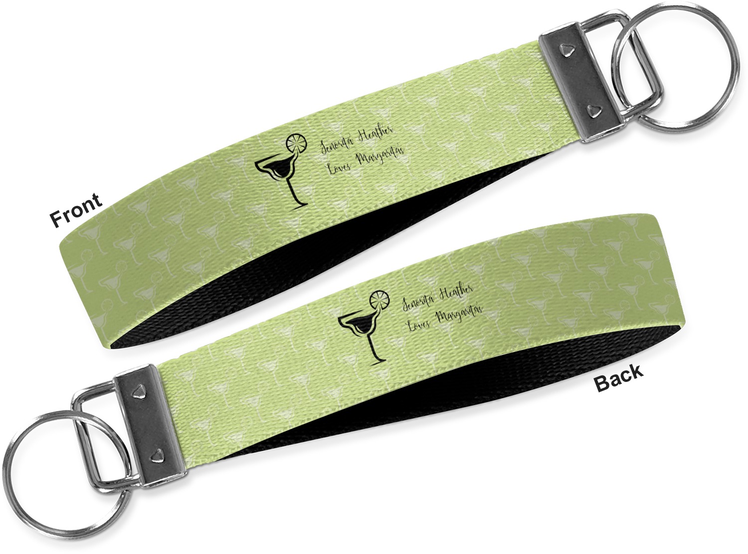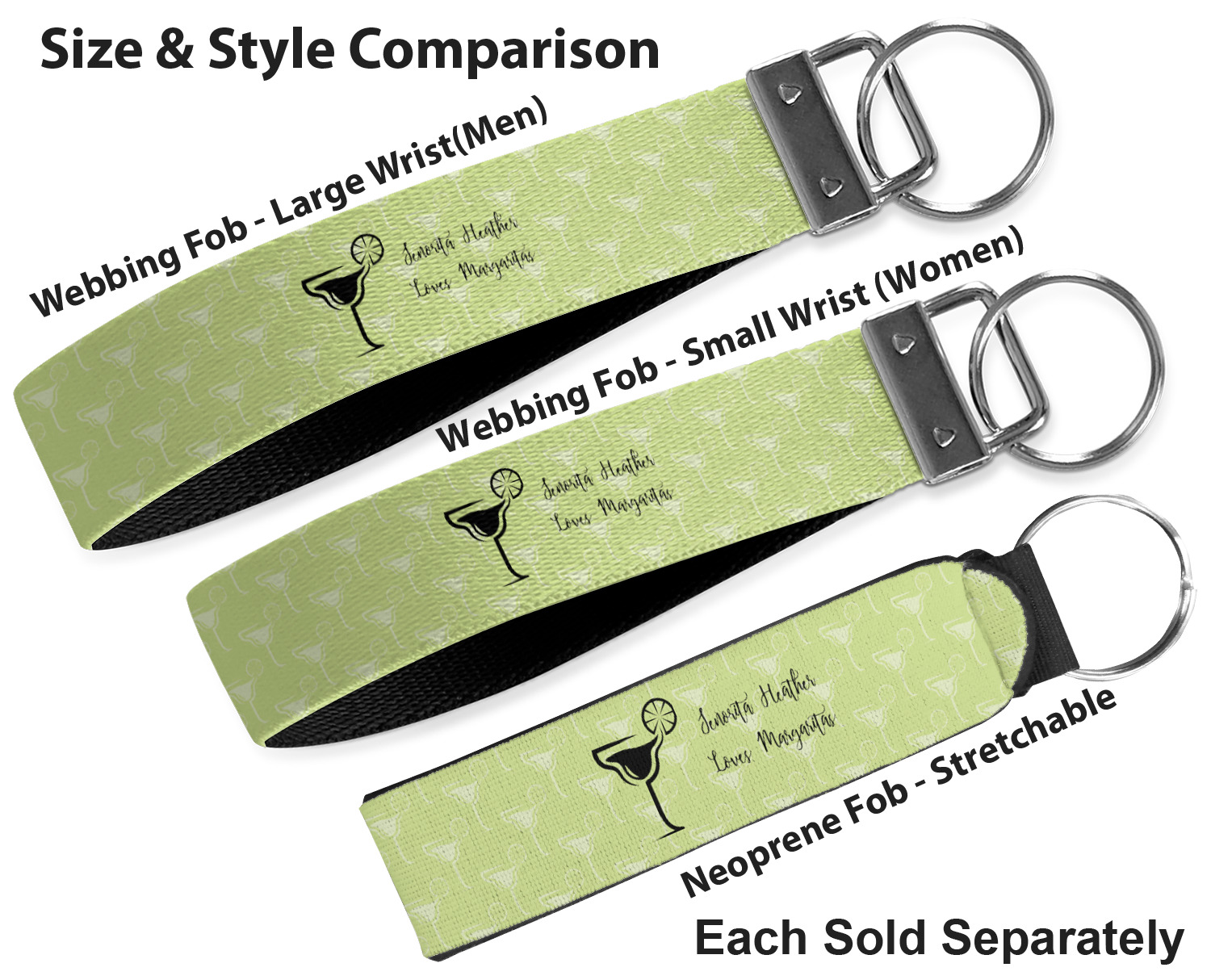 These key fob keychains are made from a polyester weave, right here in the USA. They feature a silver, metal clasp, attached to a round keyring. The piece gives the personalized wristlet a beautiful, finished look. Your customized design is printed on the outside of the keychain strap. We carry these wristlets in two sizes: small, which is 5 inches in width, and large, which is 5.5 inches in width.