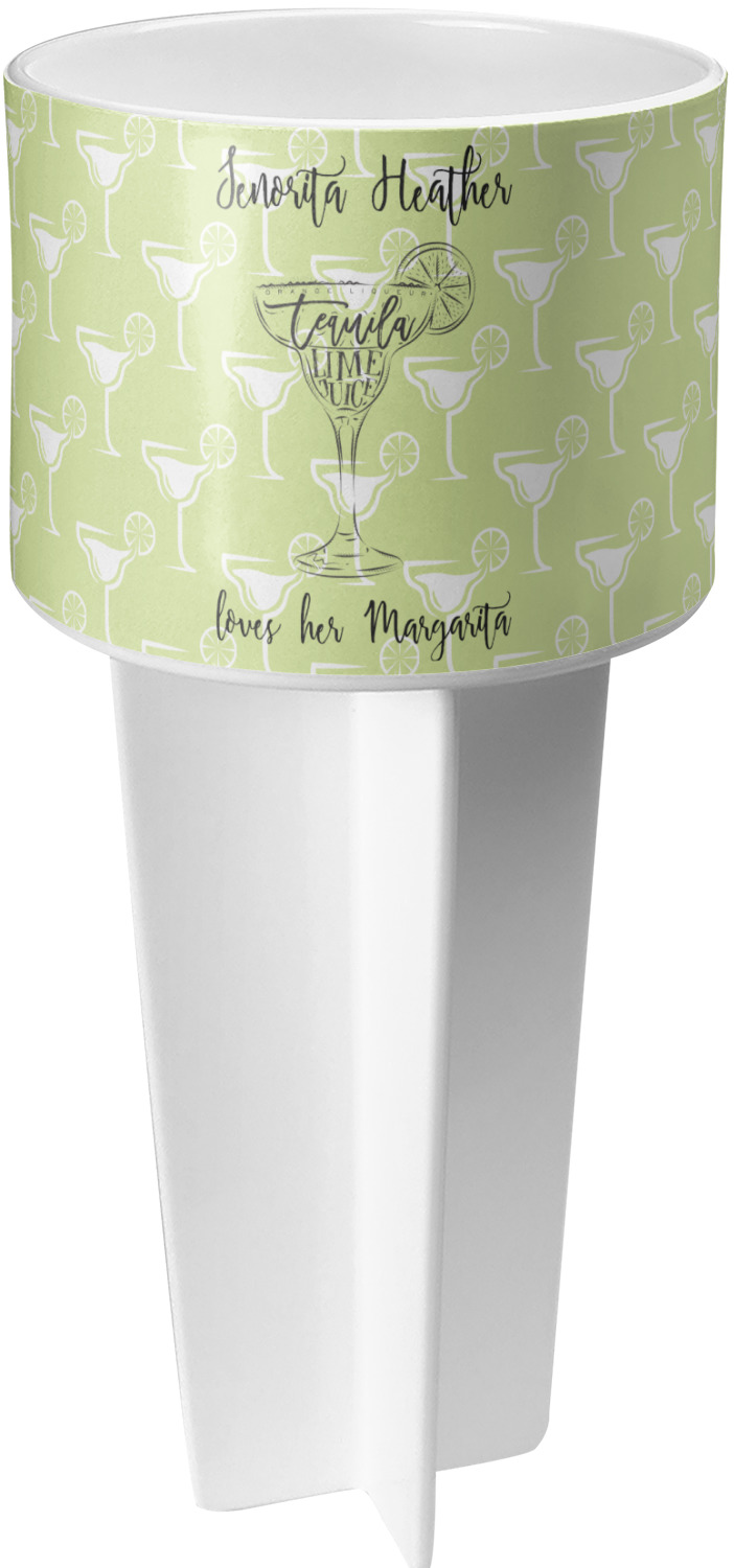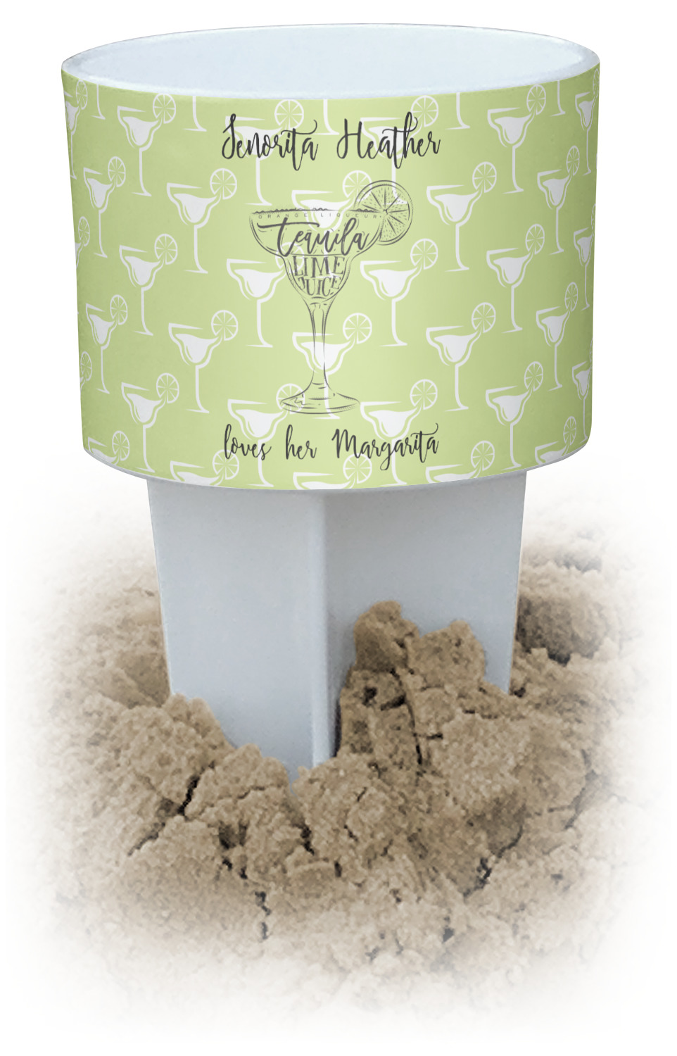 This cup holder has a large stake at its bottom that anchors it to the sand or ground below, while the cup holder rests above the stake. The entire drink holder is made of durable plastic and displays your customization around the cup holder portion. We sell these personalized beach spikers in two different colors: black and white.