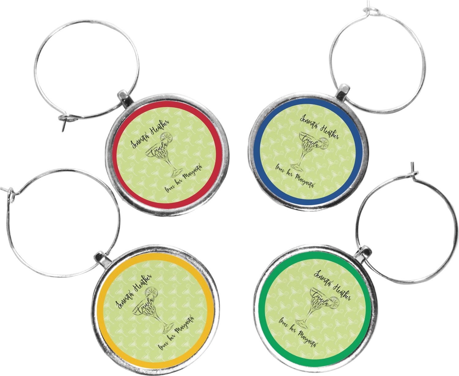 Your wine glass markers are comprised of a circular zinc plate with a 1.25 inch diameter. The zinc plate hangs from a zinc loop, which can be easily secured and removed from the stem of a wine glass. Your customized design is printed onto a 1 inch diameter insert, and then placed into the wine glass charm itself. Though sold in a set of four, you can personalize each charm individually and change the colors of the ring around your design, depending on your needs.