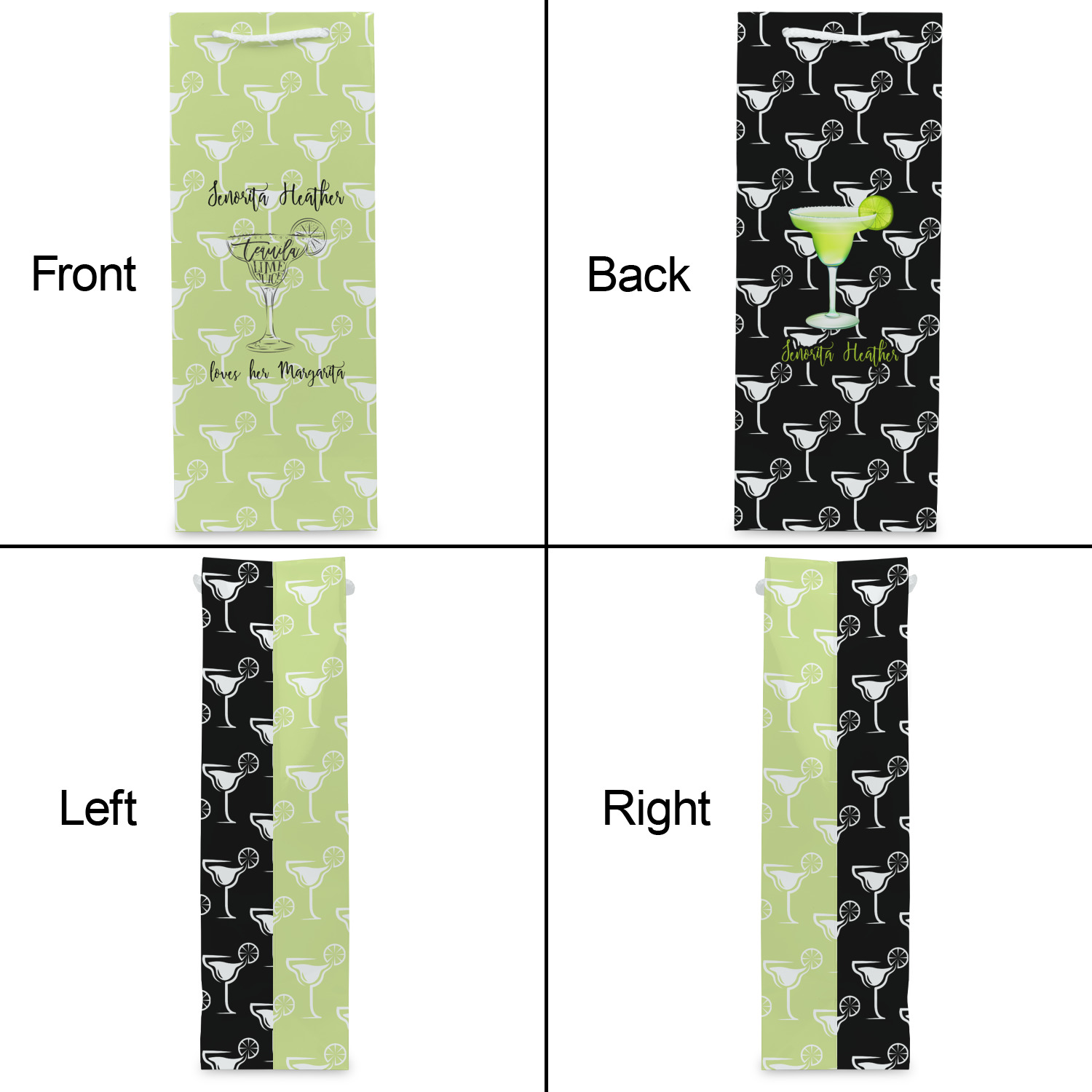 This margarita design has a lovely black illustration of a margarita glass with text inside saying "orange liqueur," "tequila," and "lime juice." Above and below this graphic is where your personalization goes. The pattern behind the graphic has a simpler margarita glass that is a light green while the rest of the pattern is a light lime green. This is a fun design to put on your beach, pool, or kitchen accessories.