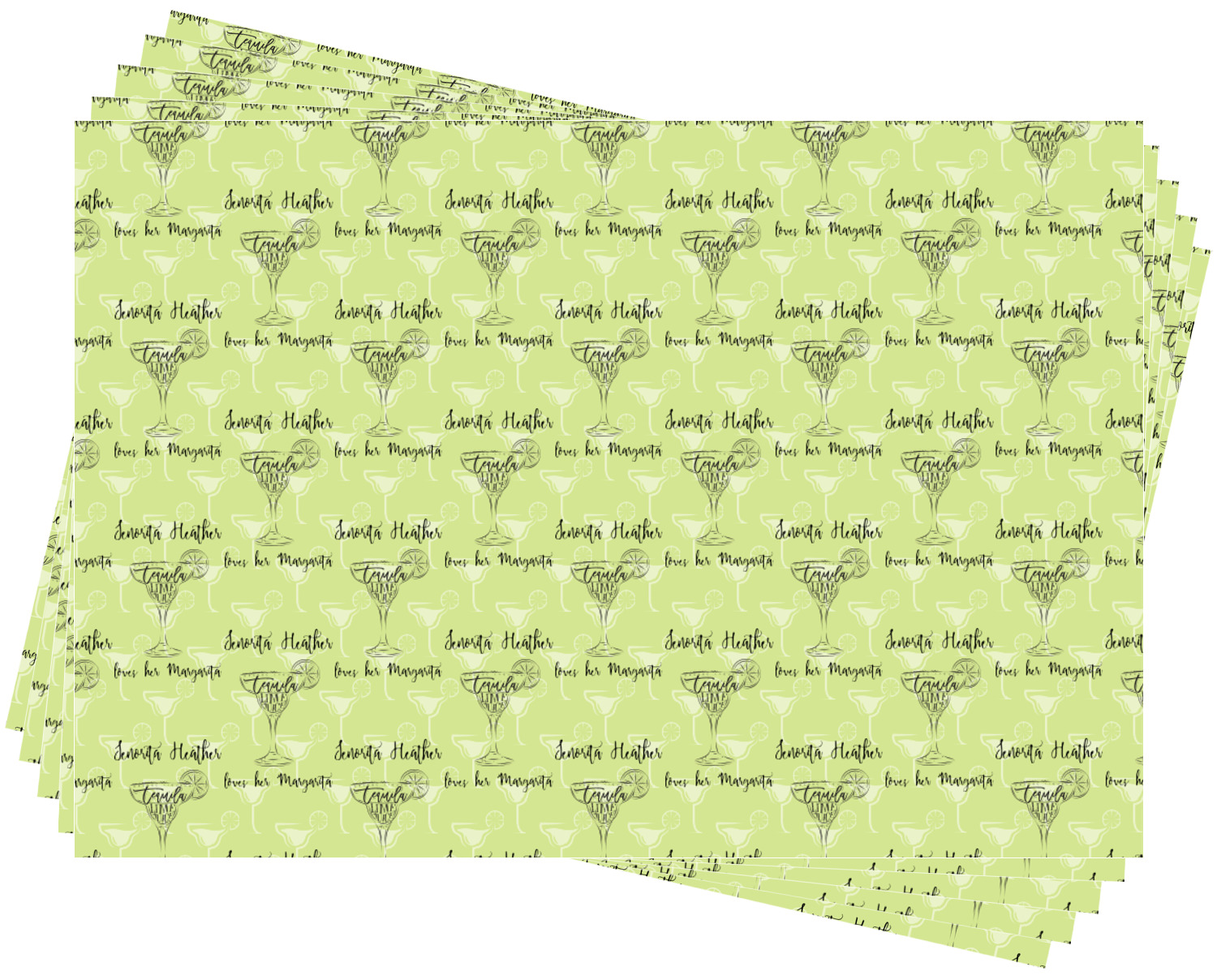 This margarita design has a lovely black illustration of a margarita glass with text inside saying "orange liqueur," "tequila," and "lime juice." Above and below this graphic is where your personalization goes. The pattern behind the graphic has a simpler margarita glass that is a light green while the rest of the pattern is a light lime green. This is a fun design to put on your beach, pool, or kitchen accessories.