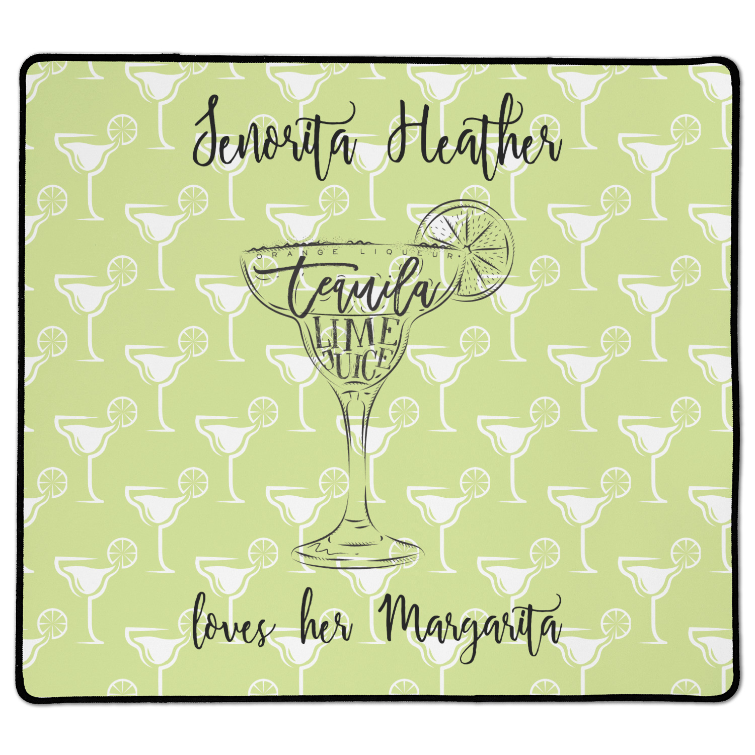This margarita design has a lovely black illustration of a margarita glass with text inside saying "orange liqueur," "tequila," and "lime juice." Above and below this graphic is where your personalization goes. The pattern behind the graphic has a simpler margarita glass that is a light green while the rest of the pattern is a light lime green. This is a fun design to put on your beach, pool, or kitchen accessories.