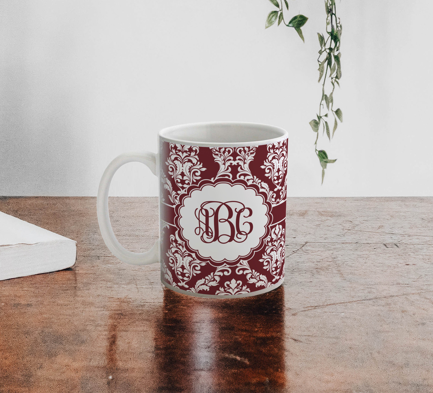 Maroon & White create a great combination. This simple, yet elegant design features our popular damask with a ribbon and an interlocking monogram in a scalloped label.