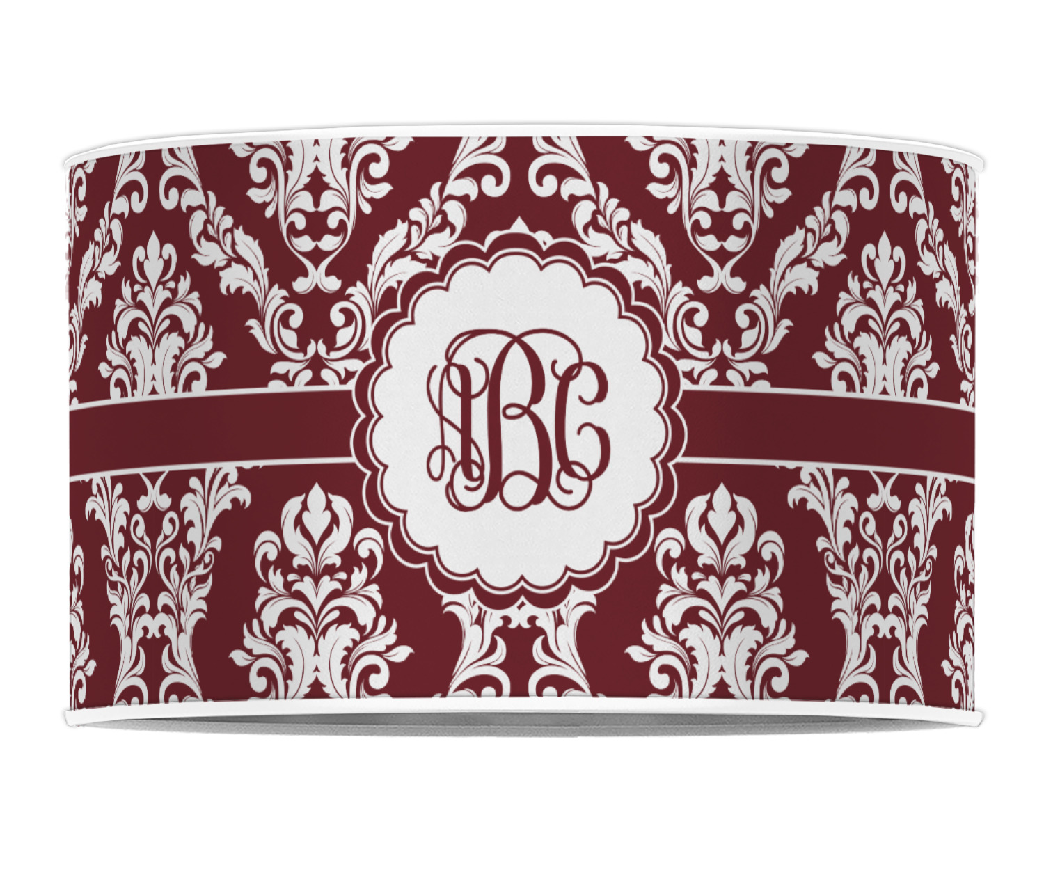 Maroon & White create a great combination. This simple, yet elegant design features our popular damask with a ribbon and an interlocking monogram in a scalloped label.