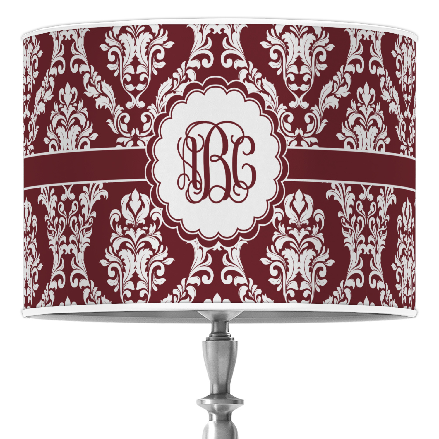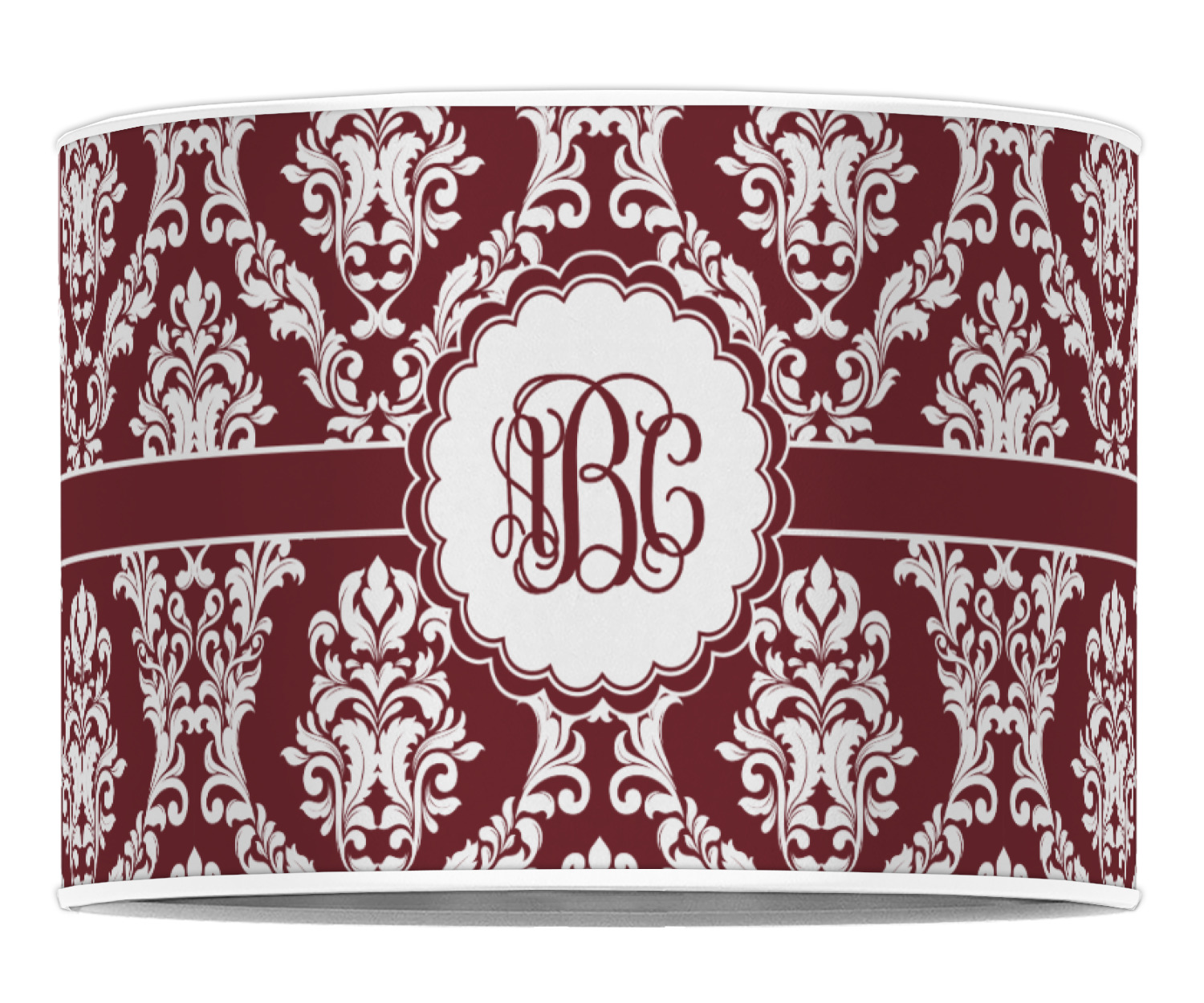 Maroon & White create a great combination. This simple, yet elegant design features our popular damask with a ribbon and an interlocking monogram in a scalloped label.