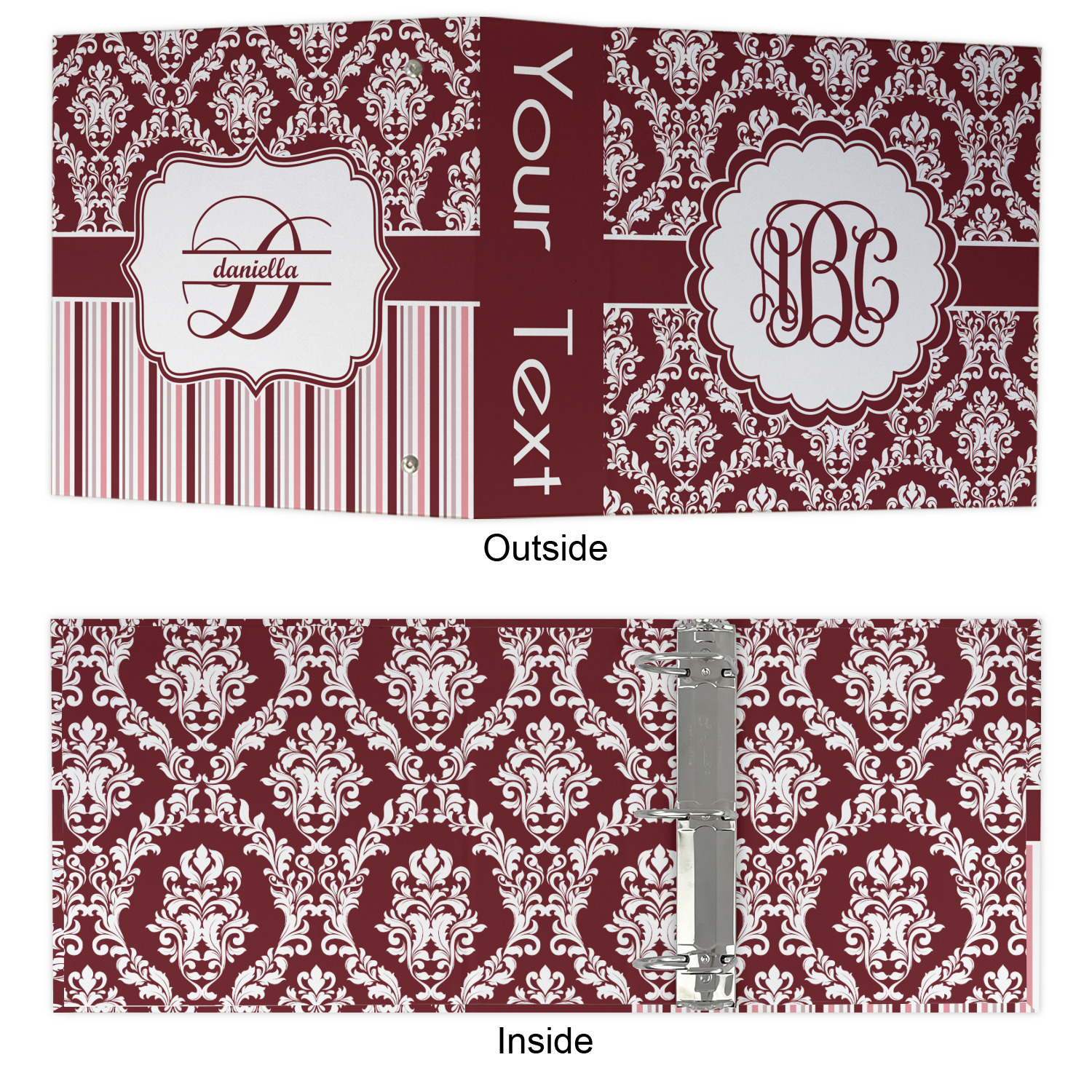 Made from a sturdy cardboard base with a full high quality canvas textured vinyl wrap with the design of your choice. Unlike our standard 3-ring binder with the full wrap design your artwork wraps from the front and back and into the inside of the binder.