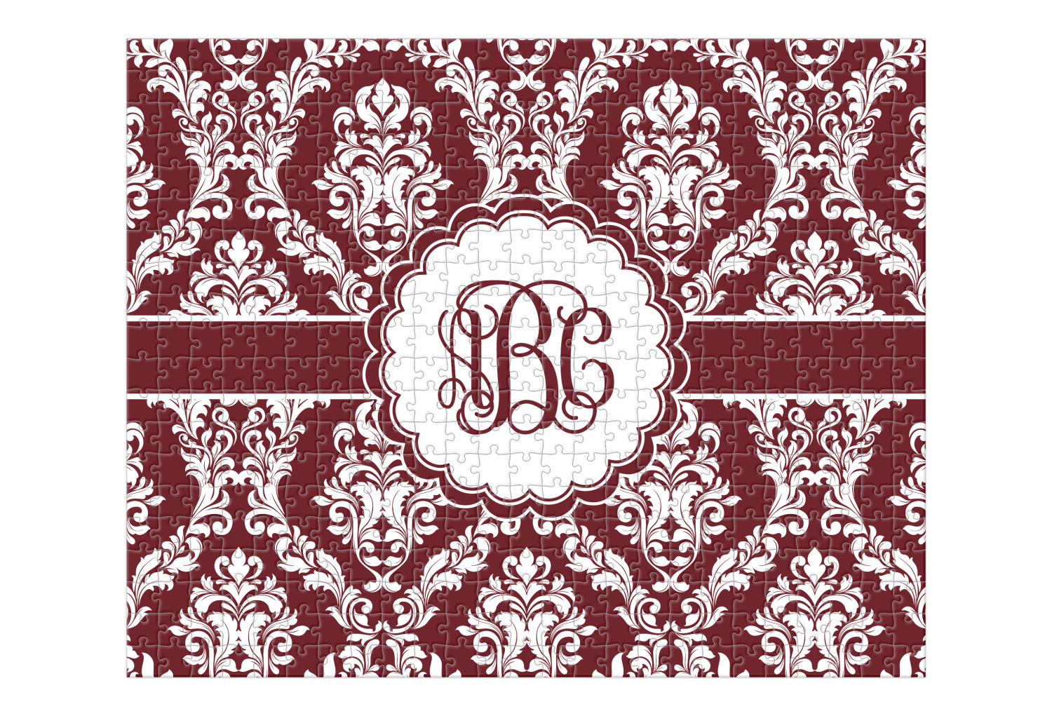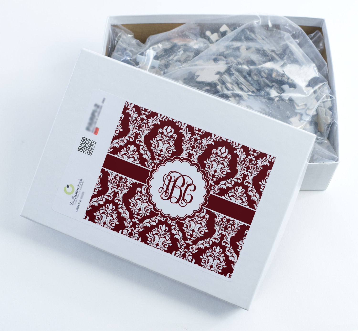 Maroon & White create a great combination. This simple, yet elegant design features our popular damask with a ribbon and an interlocking monogram in a scalloped label.