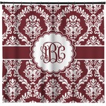 Maroon & White create a great combination. This simple, yet elegant design features our popular damask with a ribbon and an interlocking monogram in a scalloped label.