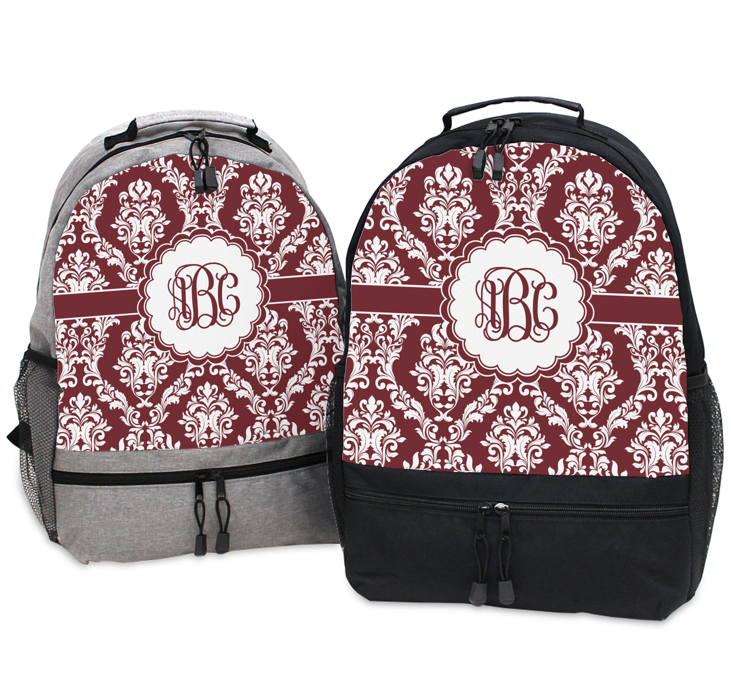 Maroon & White create a great combination. This simple, yet elegant design features our popular damask with a ribbon and an interlocking monogram in a scalloped label.