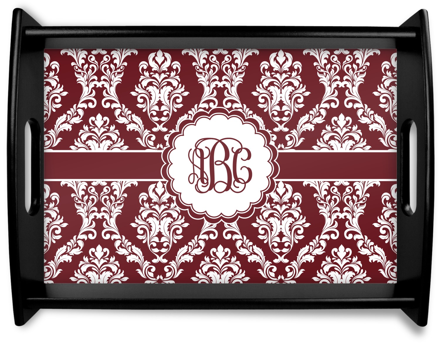 This serving tray with handles features square edges and two rounded sides, creating a very modern look. Each side is fabricated from a beautifully cut, natural wood. The bottom of the interior of the tray displays your customized design in bright, vibrant color. The tray is sold in both a black color and a natural wood look. Each variation of the wood serving tray has two sizes: Small, which is 14" x 10" x 2.25", and Large, which is 19.5" x 13.5" x 2.75".