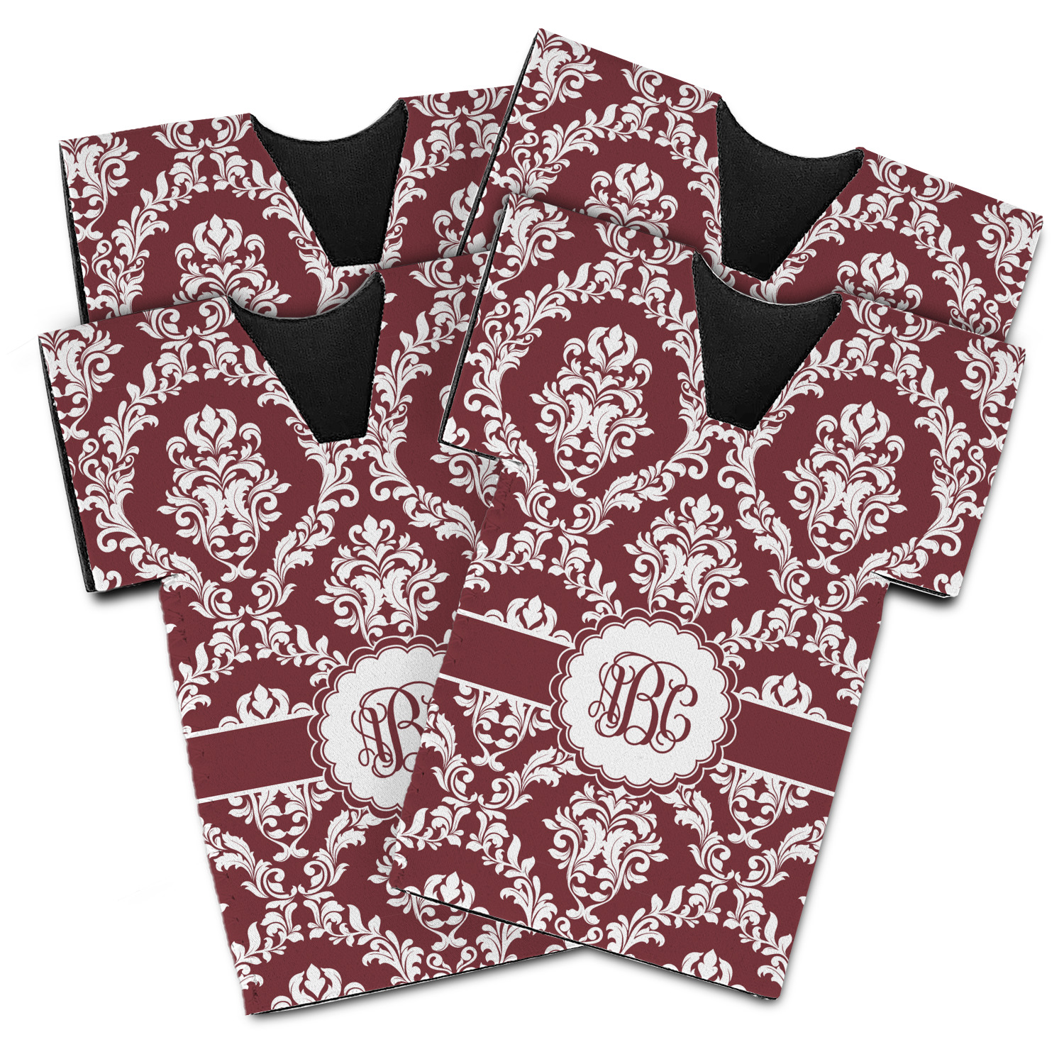 Maroon & White create a great combination. This simple, yet elegant design features our popular damask with a ribbon and an interlocking monogram in a scalloped label.