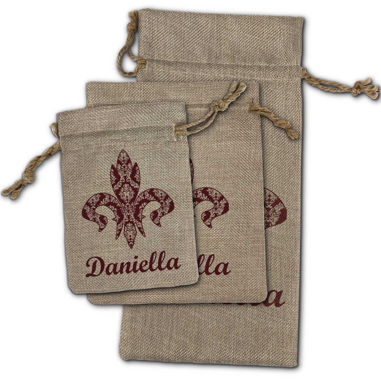 We sell our Burlap Gift Bags in 3 variant sized bags. Made with burlap polyester, each personalized bag can be secured with a twine drawstring pull. Your custom design is available to print on one side or both sides - completely up to you! The sizes of the bags measure approximately 4.5" x 6.5" for the smallest size, 6.5" x 8.0" for the medium size, and 6.5" x 13.5" for the large-sized bag.