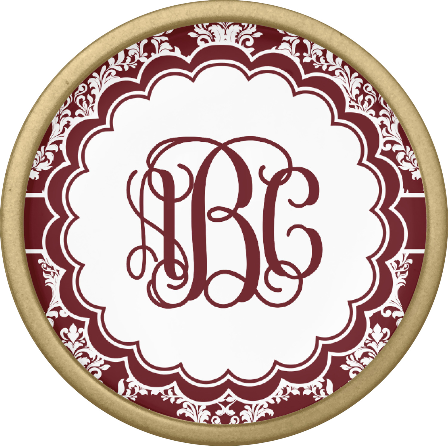 Maroon & White create a great combination. This simple, yet elegant design features our popular damask with a ribbon and an interlocking monogram in a scalloped label.