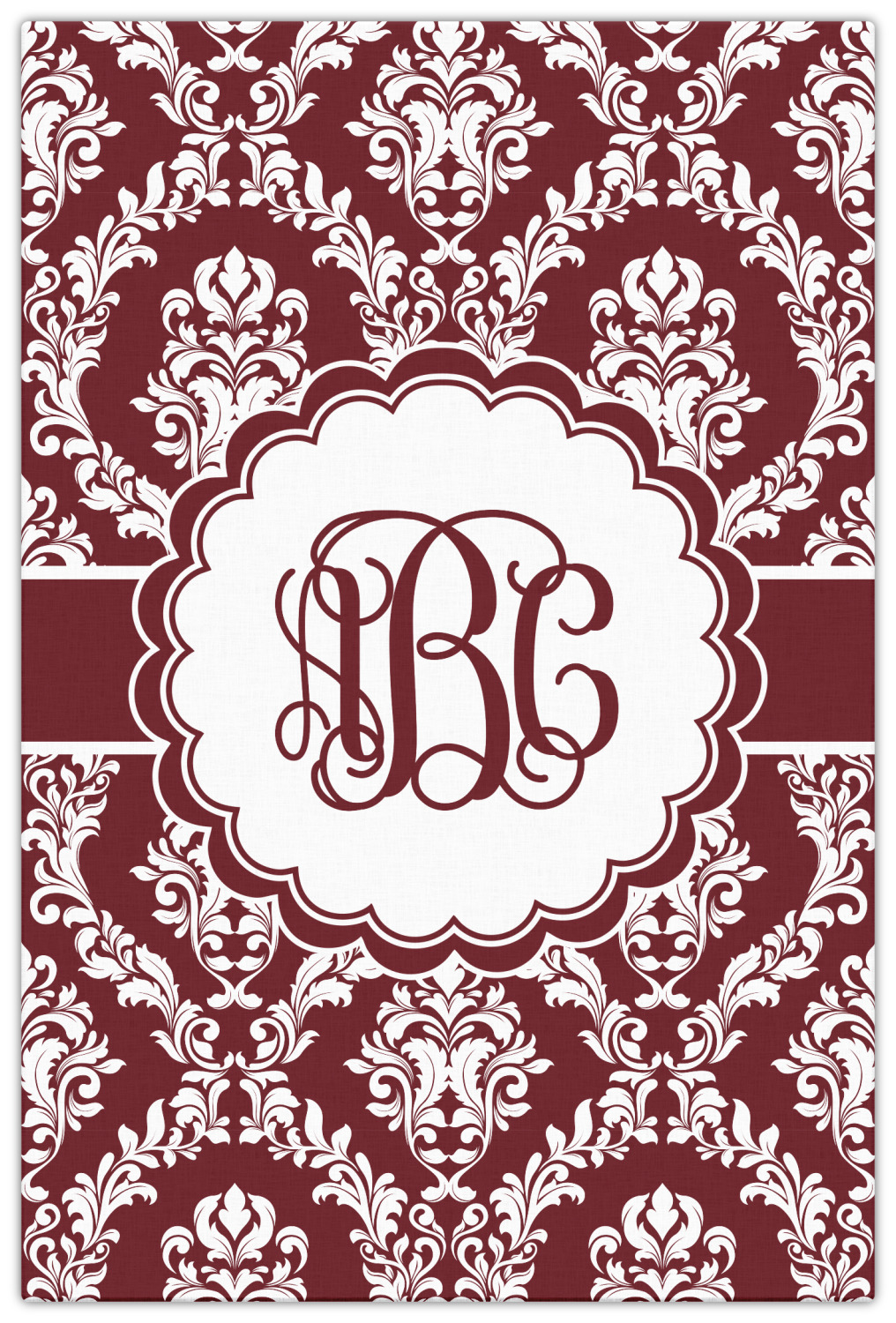 Maroon & White create a great combination. This simple, yet elegant design features our popular damask with a ribbon and an interlocking monogram in a scalloped label.