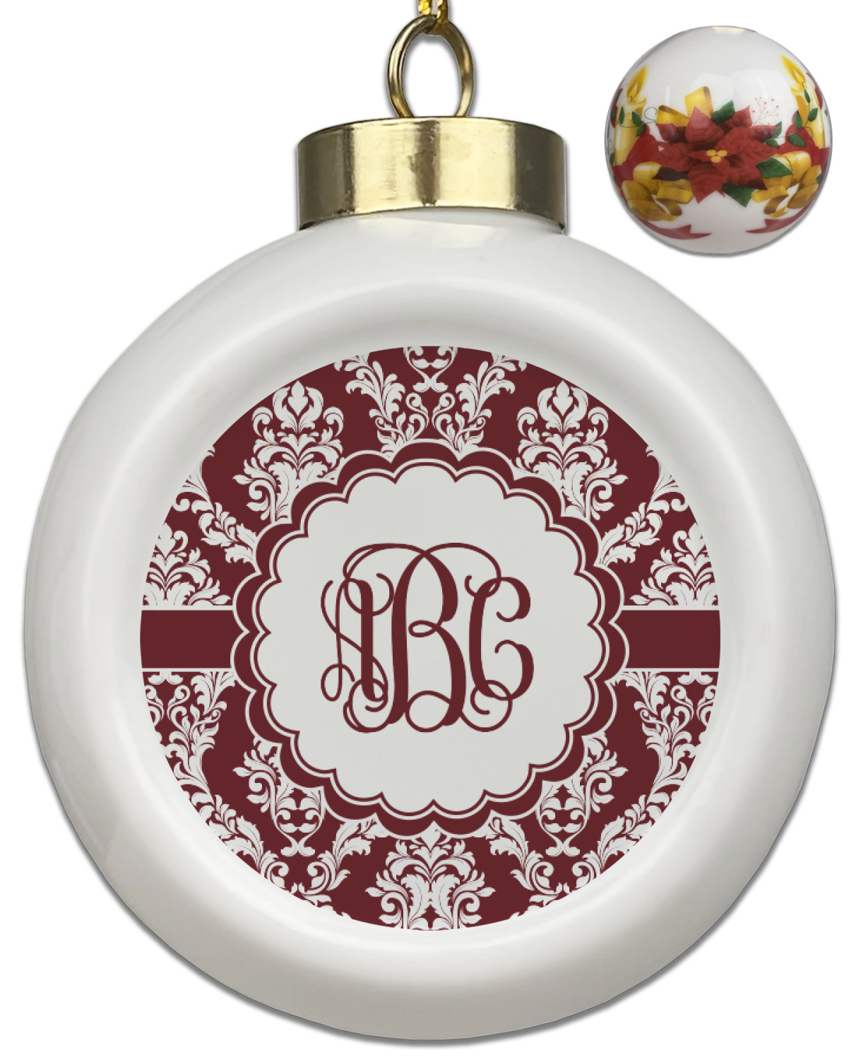 Our Christmas ornaments are a unique ceramic ball shape with a twist as it has a flat face to display your custom design! Select from one of our two design types - Christmas Tree or Poinsettia Garland - to adorn the curved back of your personal design. Each ornament measures 3H x 2.5W x 2D accompanied with a gold string accent for finishing touches to hang on your beautiful Christmas tree!